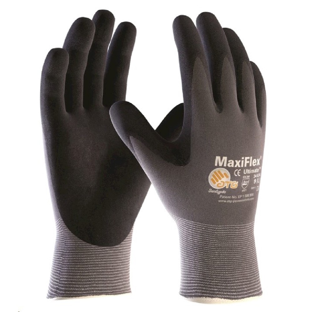 ATG ochranné rukavice MaxiFlex®Ultimate 34-874, vel. 6-11 Specifikace Bezešvé pletené montážní rukavice. Patentovaný nitrilový mikropěnový povrstvený povrch pro práci vsuchém prostředí. Vynikající flexibilita a vynikající hmatový pocit. 360o prodyšné. Odolnost proti otěru Úroveň 4. Neobsahuje silikon. Oblasti použití: Ideální pro všechny práce vsuchém prostředí s vysokými nároky na citlivý hmatový dotyk, suchou přilnavost, jemnou montáž, obalový průmysl, logistiku a řadu řemeslných oblastí Technické údaje Značka: ATG Velikost: 6 - 11 Materiál: nitril-mikro pěnový povlak Barva: šedá/černá Norma: EN 388 Kategorie: kategorie II Kód barvy: černá