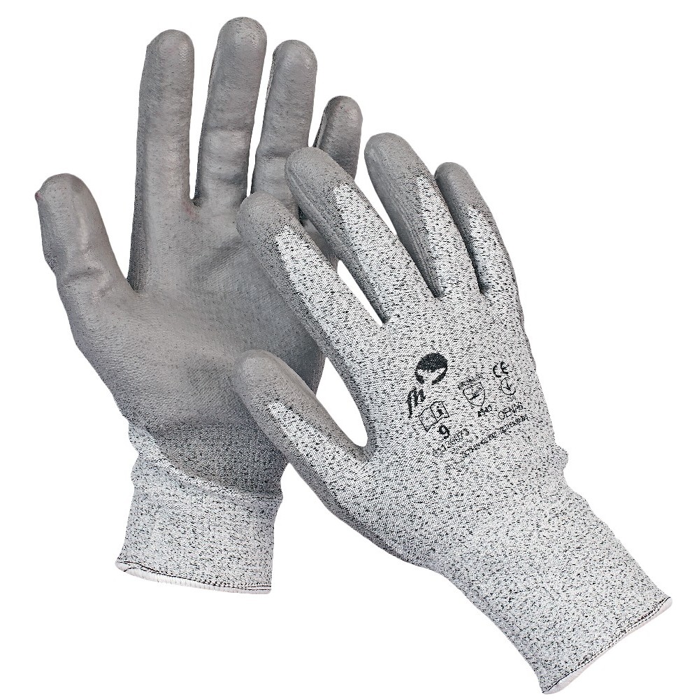 Rukavice OENAS, proti pořezu, s vláknem DYNEEMA a nylonem Pletené bezešvé rukavice s vysokou odolností proti pořezu ostřím, s vrstvou šedého PU v dlani a na prstech Velikost: 7-11
