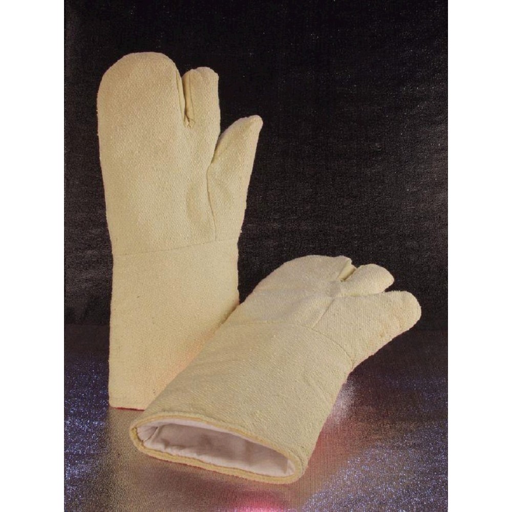 Rukavice SAHARA 3DM teplood.tříprsté dlouhá manžeta Oboustranné tříprsté tuzemské rukavice, šité z Kevlaru, s vysokou mechanicku odolností, vložka ze 100% vlny, bavlněná vrstva zvyšuje komfort užití, ochrana před teplem do 450°C, krátkodobě do 600°C, délka 42 cm.