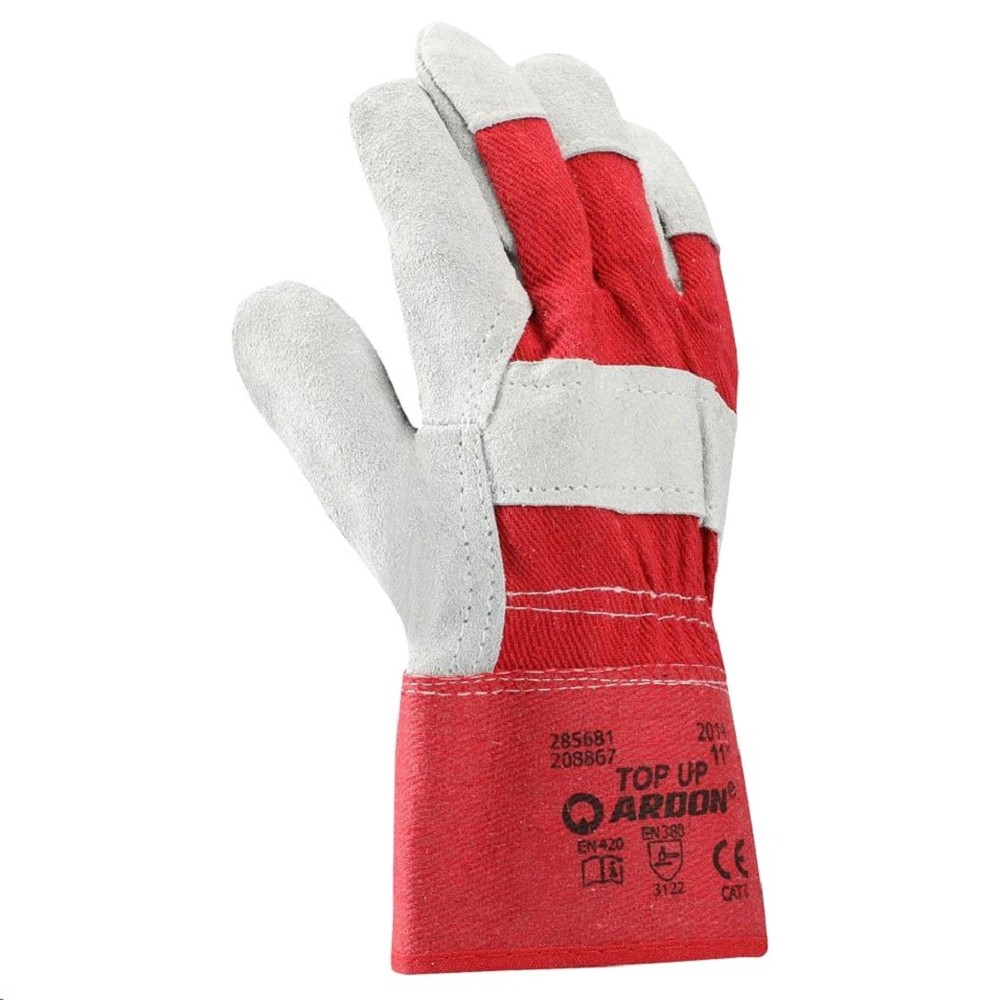 ARDON TOP UP A285681 rukavice kombinové, hovězí štípenka +bavlněná tkanina Dlaň z šedé hovězí štípenky, hřbet a vyztužená manžeta z červené bavlněné tkaniny, podšívka ve dlani. Norma: EN388, 3142 vel. 13