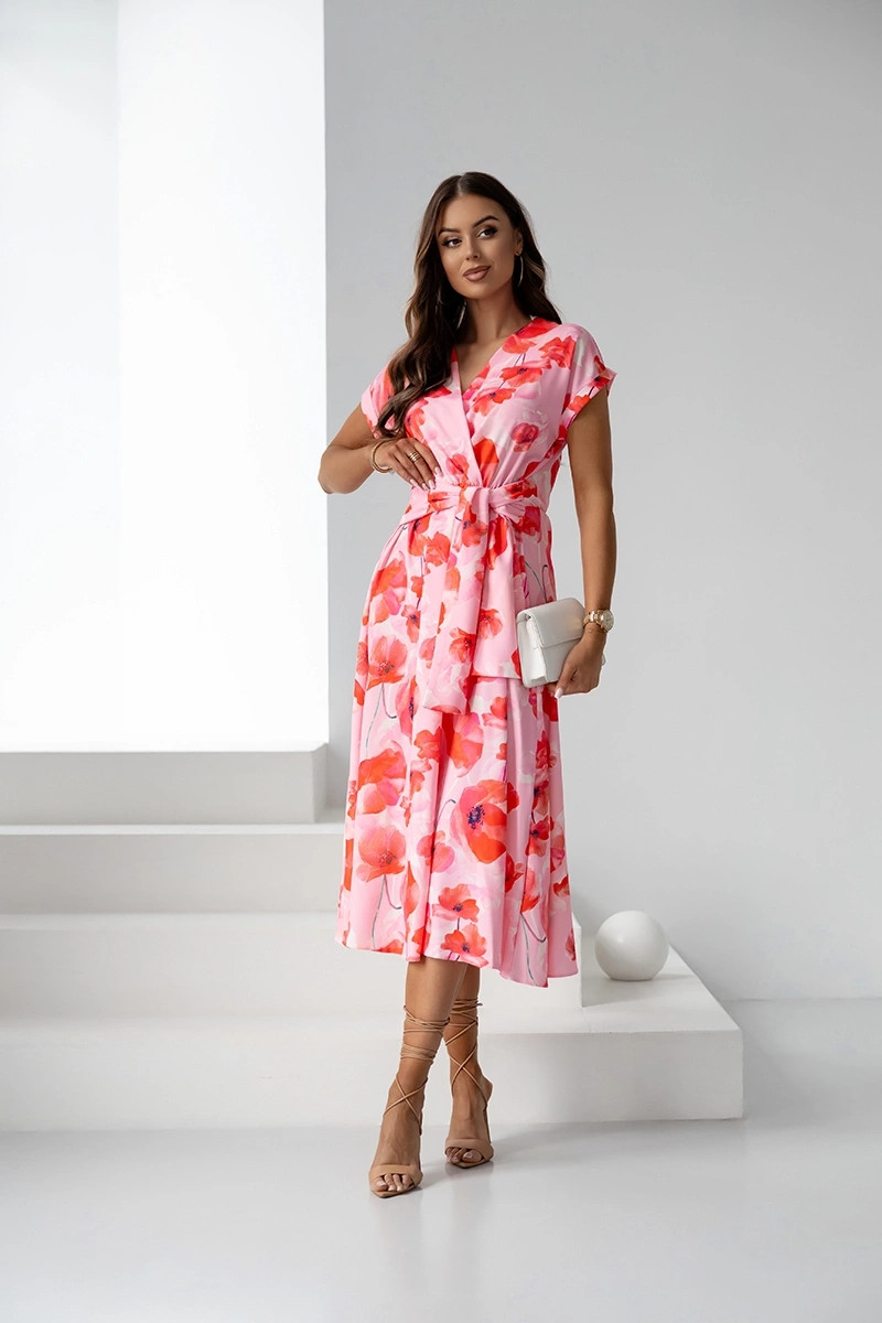 Věnujte prosím pozornost při výběru velikosti dle velikostní tabulky uvedené níže. Velikosti neodpovídají běžně nošené konfekci. Šaty s krátkými rukávy Šaty mají přeložený obálkový výstřih. Rukávy jsou netopýřího typu. V pase modelu je guma a šňůrka pro zavazování. Spodní část šatů je jednoduchá a sahá pod kolena. Šaty jsou polský výrobkem. Složení: 65 % polyester, 35 % viskóza.
