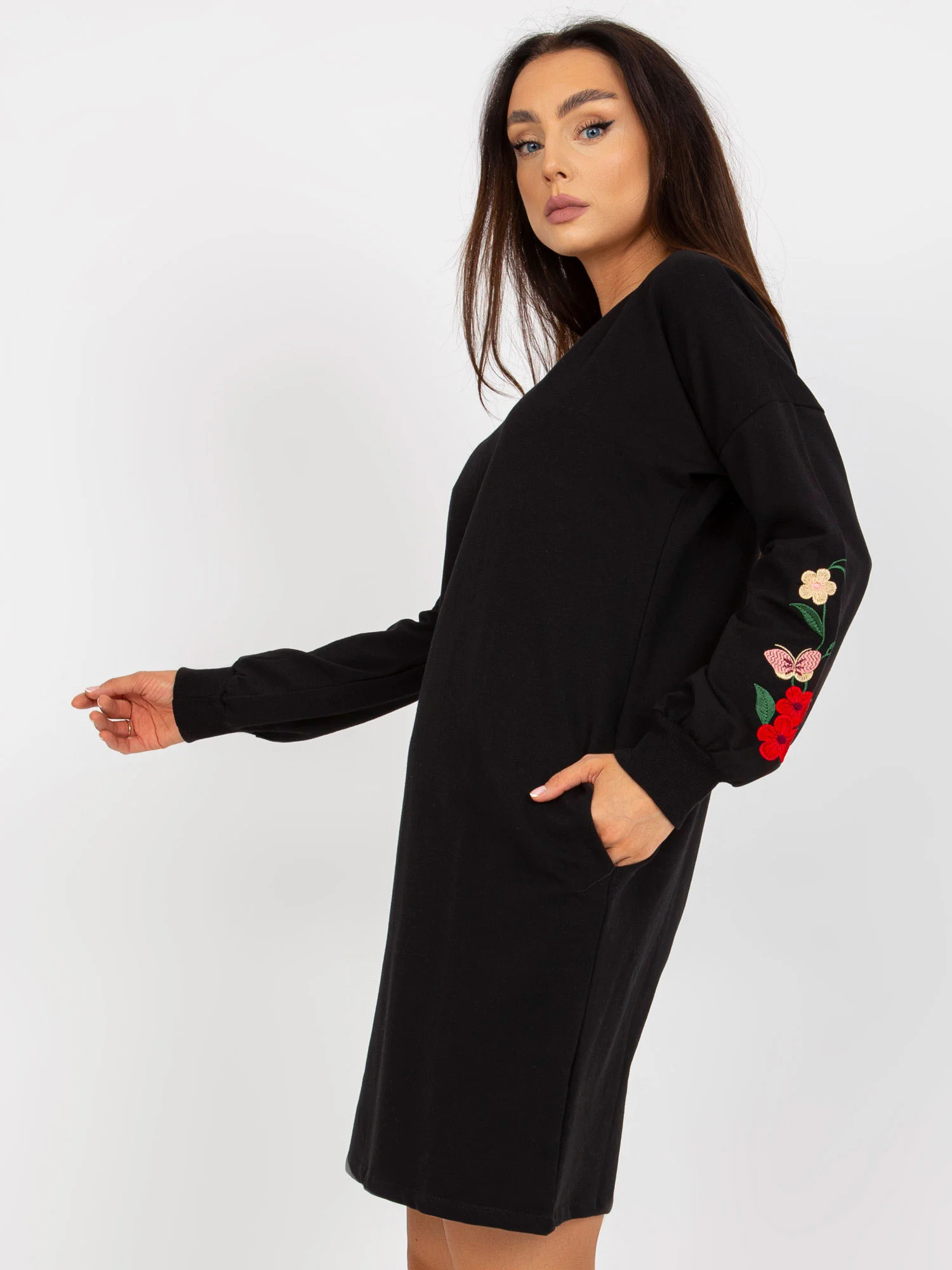Černé mini teplákové šaty s výšivkou RUE PARIS .doplňky: kapsymateriálové složení: 90% bavlna, 10% elastanzpůsob praní: praní v pračce na 30 °CKód produktu: RV-SK-8088.59dominantní vzor: hladkýstyl: ležérnípříležitost: neformální, pracovní, vycházky, letní Modelka má na sobě velikost S/M. Míry modelky: výška 171 cm, prsa 84 cm, pas 60 cm, boky 88 cm.Rozměry šatů ve velikosti S/M měřené na plocho: šířka v podpaží - 58 cm, celková délka - 90 cm, délka rukávu - 56 cmMezinárodní velikostVýškaObvod hrudníkuObvod pasuS/M36-38160-17282-8672-86L/XL40-42164-17891-9684-96