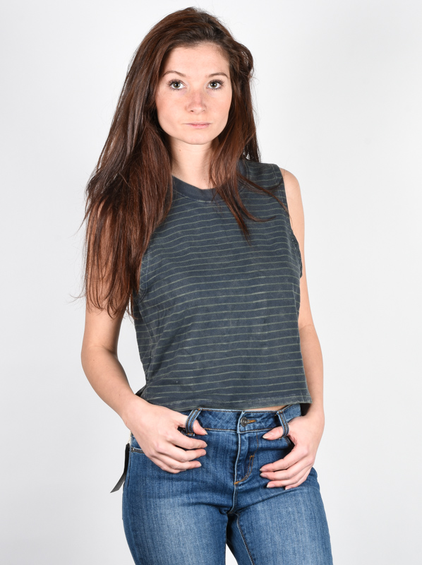 Šedivé dámské tílko Rvca Minor Bet Greyskull s pruhovaným a sepraným efektem. Má vysoký, kulatý výstřih, rozparek u bočních švů a kratší střih.