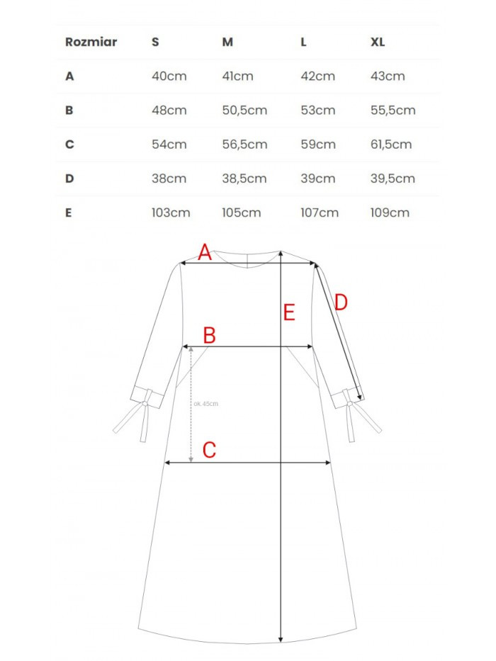 65 % polyester 30 % viskóza 5 % elastan DETAILY PRODUKTU: tkaný materiál áčkové šaty s délkou pod kolena tříčtvrteční rukávy se zavazováním zaoblený výstřih skrytý zip na zádech bez podšívky naše modelka měří 175 cm a nosí velikost S navrženo a vyrobeno v PolskuVELIKOSTSMLXLA40 cm41cm42cm43cmB48cm50,5cm53cm55,5cmC54cm56,5cm59cm61,5 cmD38cm38,5cm39cm39,5cmE103cm105cm107cm109cm