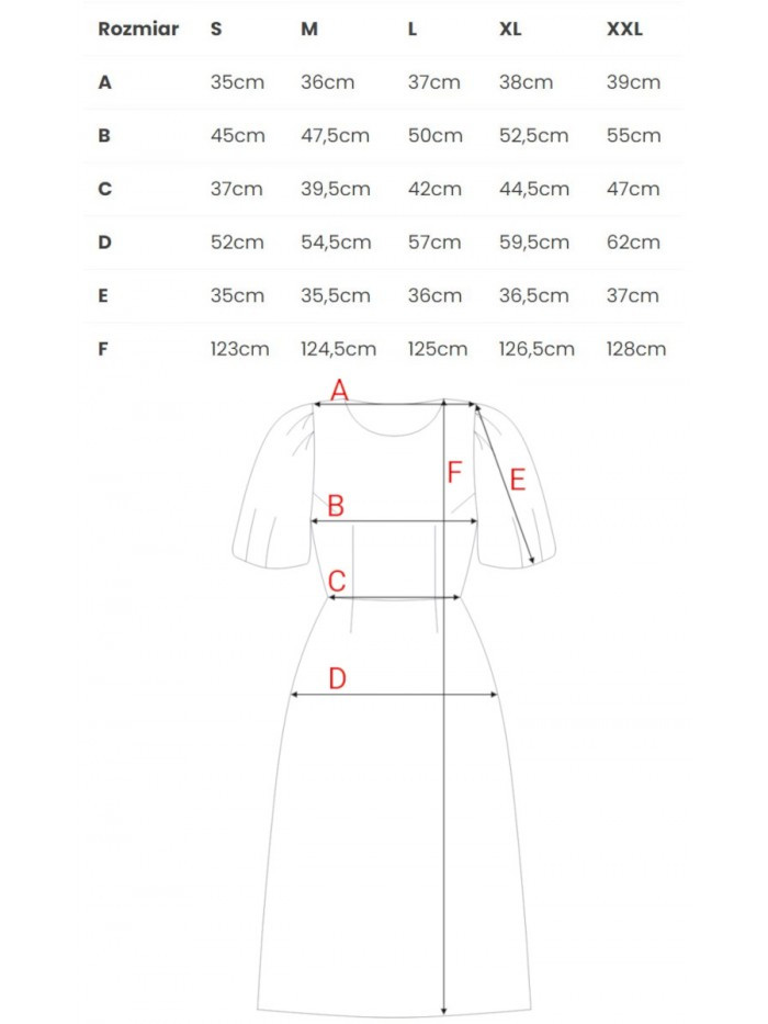 95% polyester 5% elastan DETAILY PRODUKTU: tkaný materiál přiléhavý střih midi šaty krátké pouzdrové rukávy zaoblený výstřih vpředu výstřih do V vzadu skrytý zip na zádech částečně podšité naše modelka měří 175 cm a nosí velikost S navrženo a vyrobeno v PolskuVELIKOSTSMLXLXXLA35 cm36cm37cm38cm39cmB45cm47,5cm50cm52,5cm55cmC37cm39,5cm42cm44,5cm47cmD52cm54,5cm57cm59,5cm62cmE35cm35,5cm36cm36,5cm37cmF123cm124,5cm125cm126,5cm128cm