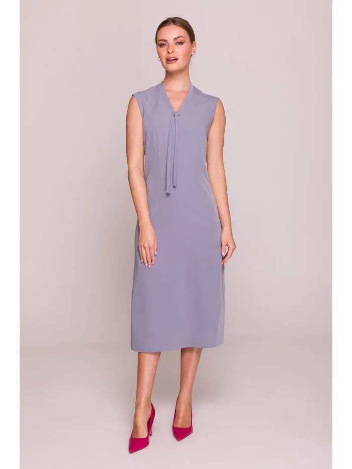 S410 Šaty áčkového střihu s vázáním a výstřihem do V - holubičí šeď EU XXL