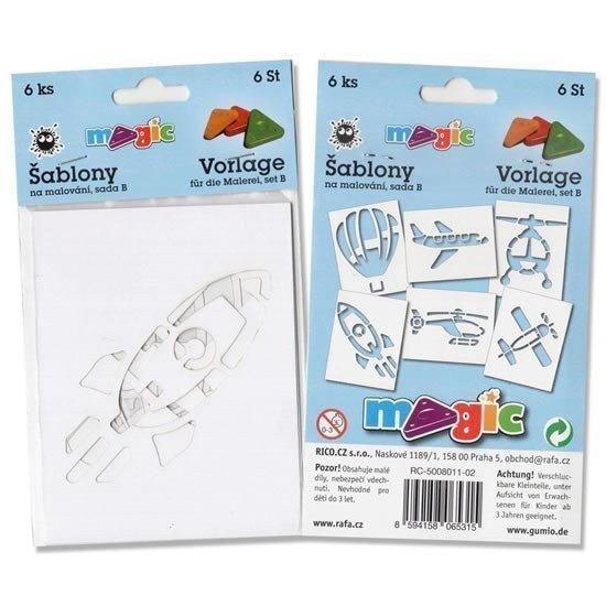 Sada 6 ks papírové šablony na malování. Materiál bílý karton 220 g.. Sada 6ks šablony na malování s motivy vždušné dopravy Materiál bílý karton 220g. Doporučujeme pro malování s magickými voskovkami, vhodné i pro tupování s temperami. Rozměry šablony: 11x14cm. Nevhodné pro děti do 3.let, obsahuje malé dílky.
