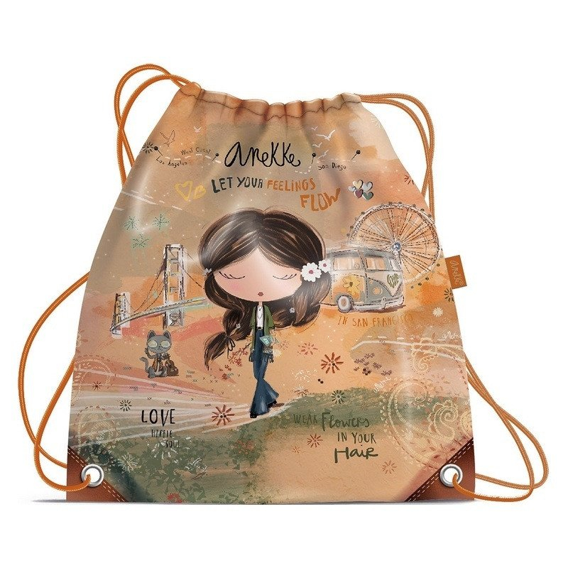 Školní sáček na přezůvky a sportovní potřeby s vnitřní kapsou na zip • potištěné motivem známého děvčátka Anekke z dílny španělské designérky • kapsa, neboli sáček je skvělý na školní úbor, výtvarnou výchovu, ale i jako menší taštička