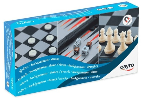 Užijte si klasické deskové hry s naší sadou 3 v 1, která zahrnuje šachy, dámu a vrhcáby. Praktická skládací krabička s magnetickými poli slouží jako hrací plocha a úložný box zároveň a je ideální na cesty. Vhodné pro děti od 7 let věku. Obsah balení: herní plocha – skládací box 15 bílých kamenů (dáma, vrhcáby) 15 černých kamenů (dáma, vrhcáby) 5 kostek (vrhcáby) 32 herních figurek ve 2 barvách (šachy) návod
