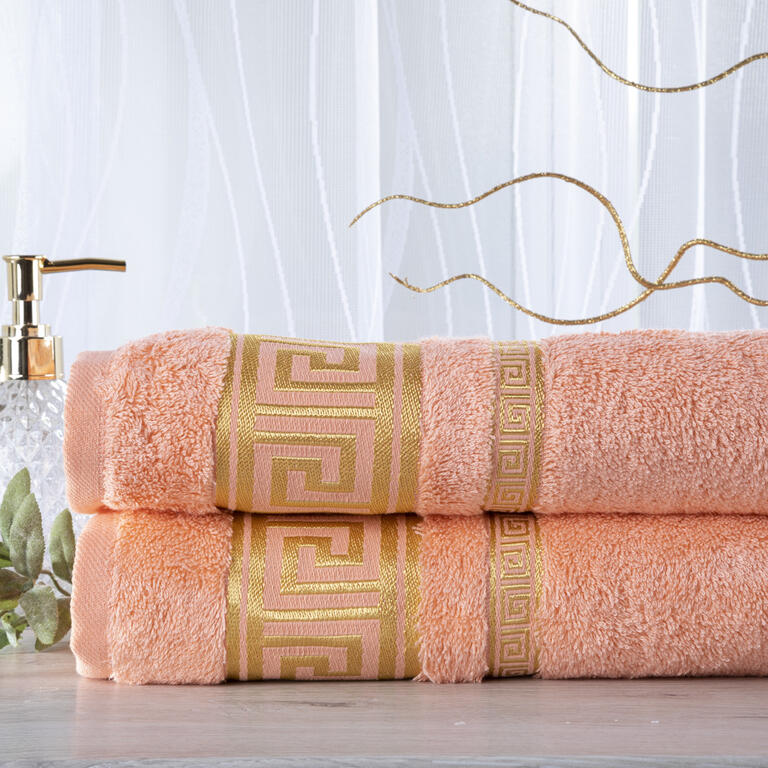 Překrásné bambusové ručníky ROMA v meruňkové barvě s tradiční řeckou bordurou. Mnoho z vás se již přesvědčilo o vysoké funkčnosti bambusových vláken, které vynikají svojí savostí a antibakteriálními účinky. Vysoká gramáž tkaniny 550 g/m2 je zárukou kvality a měkkosti. Po vyprání zůstávají ručníky z bambusové příze krásně jemné a hebké.
