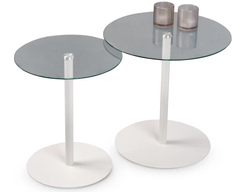 Sada 2 kusů moderních stolků z kombinace bílého kovu a čirého skla bude v obýváku působit vzdušným dojmem. Stolky mohou tvořit kompozici anebo být rozmístěny.