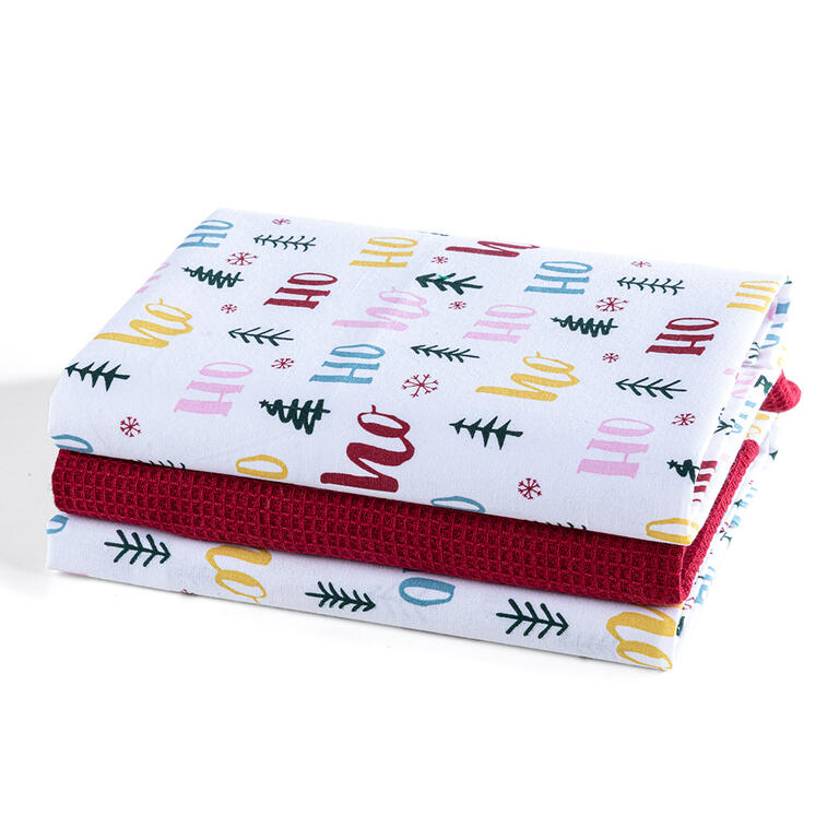 Sada tří barevně sladěných bavlněných utěrek bude dekorativním a zároveň praktickým doplňkem vaší kuchyně zejména ve vánočním období. Set obsahuje tři utěrky v dárkové krabičce, dvě bavlněné se vzorem stromečků a nápisem HO HO a jednu vaflovou utěrku ve vínové barvě. Utěrky jsou opatřeny poutky na zavěšení.
