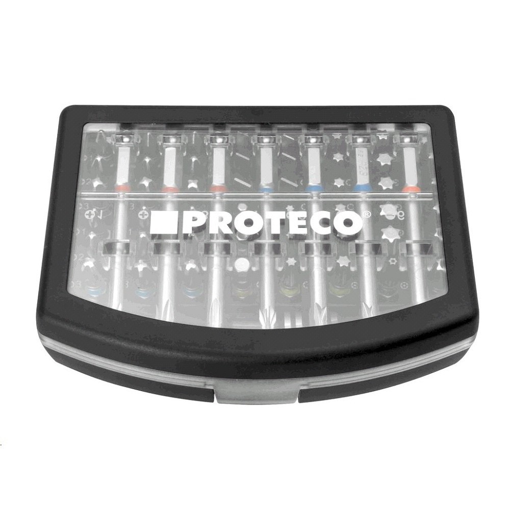 Sada bitů 1/4 56 dílů s rychloupínacím nástavcem Proteco 43.Sn-B04 Jedná se o rozsáhlou kombinaci přepínací ráčny, hlavic, vratidla a nástavců. Vše je vyrobeno z chrom-vanadiové oceli a nabízí tak svým uživatelům komfort s možností různých kombinací při používání ručního nářadí. Provedení hlavic zajišťuje bezpečný úchop hlavice šroubu či matice po celém jejím obvodu. Rukojeť přepínací ráčny je gravírovaná a zajišťuje tak kvalitní a bezpečný úchop. Sada obsahuje: Bit 1“ PH 1, PH 2, PH 3 (25 mm) PZ 1, PZ 2, PZ 3 (25 mm) PL 4.0 x 0.5 ; 6.0 x 0.8 (25 mm) H 3, 4, 5 mm Torx 10, 15, 20, 25, 30, 40 Torx s otvor. 10, 15, 20, 25, 30, 40 Držák bitů magnetický s rychloupínáním 65 mm Bit 1“ PH 1, PH 2, PH 3, PZ 1, PZ 2, PZ 3 (75 mm) 1“ PL 6.0 x 1.0 75 mm