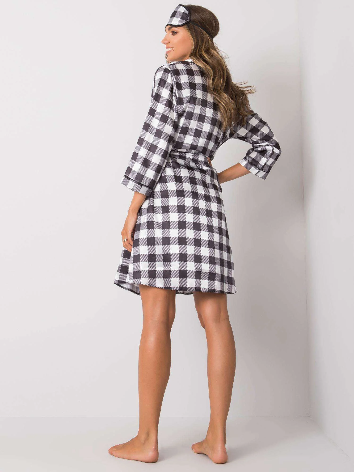 Bílo-černá dámská souprava na spaní. sada obsahuje: noční košili, župan, šátek na oči složení látky: 100% polyester způsob praní: praní v pračce na 30 °C Modelka má na sobě velikost S. Rozměry modelky: výška 175 cm, prsa 85 cm, pas 65 cm, boky 89 cm.Velikost Alt.VýškaObvod hrudníku hrudníkExterní. délka. rukávVnitřní. délka rukávůS36160-164825949M38162-172866151L40164-174916353XL42166-178966555