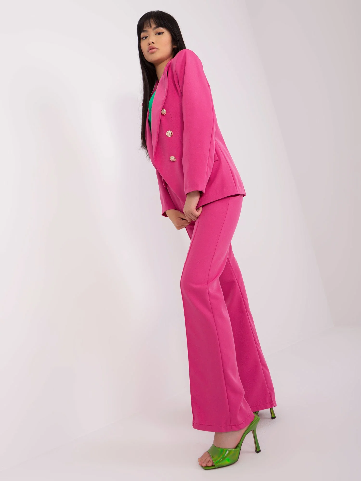 Tmavě růžový elegantní komplet s kalhotami . kód produktu: DHJ-KMPL-17162.05 dominantní vzor: hladký styl: elegantní, klasický příležitost: neformální, pracovní, rande, večírek Modelka má na sobě velikost S. Rozměry modelky: výška 167 cm, prsa 73 cm, pas 64 cm, boky 91 cm. Rozměry soupravy ve velikosti S měřené na plocho: šířka bundy v podpaží - 48 cm, délka rukávu - 55 cm, délka bundy - 62 cm, šířka kalhot v pase - 35 cm, výška v pase - 32 cm, délka kalhot - 110 cm.Velikost Alt.VýškaObvod hrudníku hrudníkExterní. délka. rukávVnitřní. délka rukávůS36160-164825949M38162-172866151L40164-174916353XL42166-1789665552XL44168-1801006757