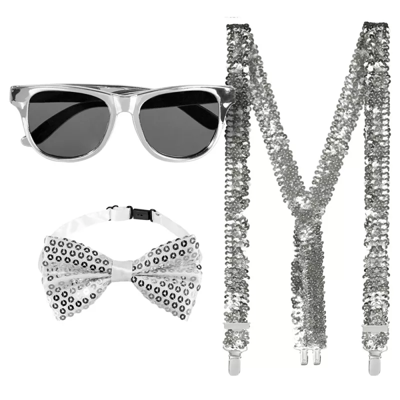 Sada obsahuje flitrované šle, flitrový motýlek a brýle.