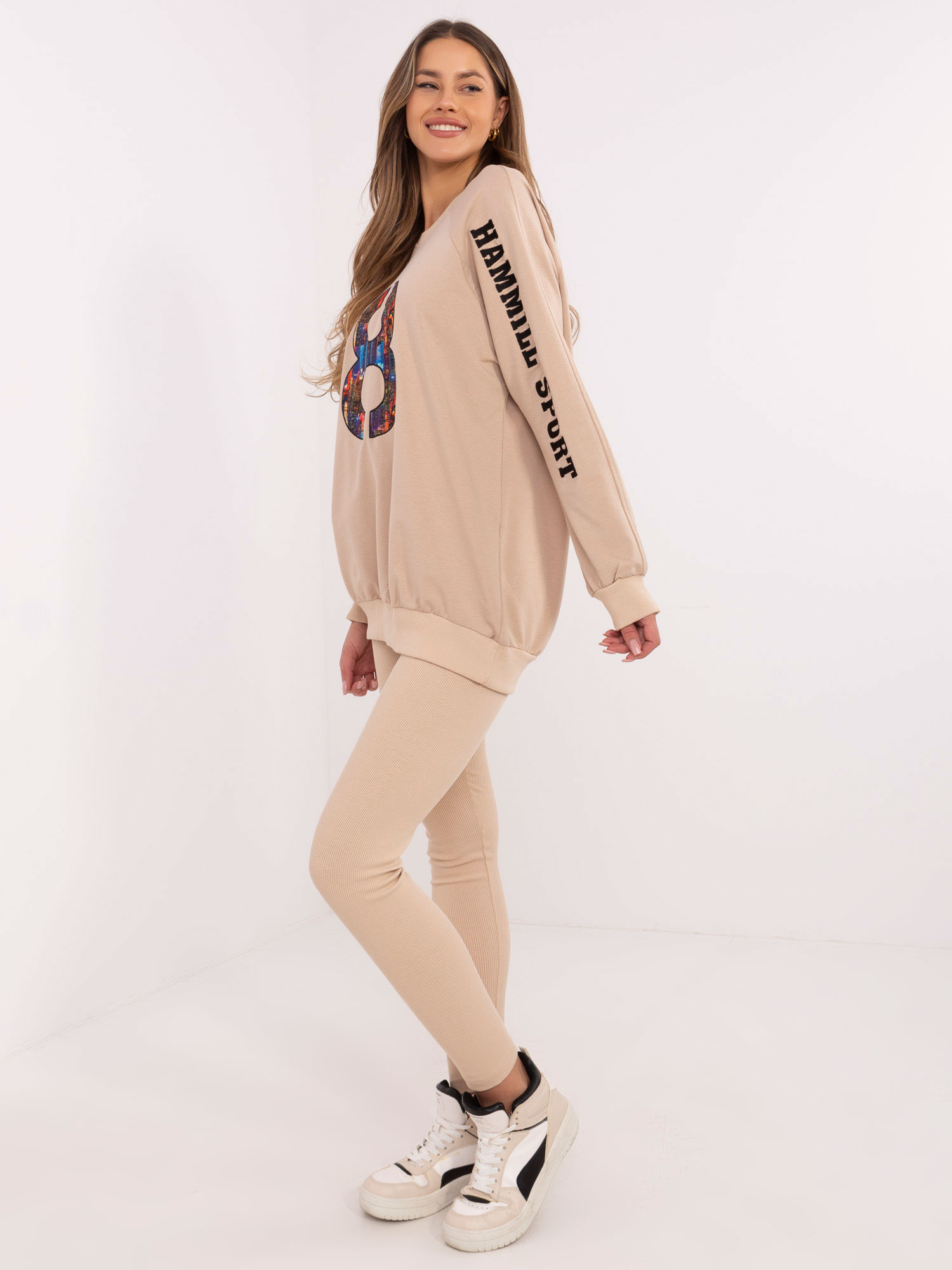 složení materiálu halenky: 72 % bavlna, 22 % polyester, 6 % elastan; složení materiálu legín: 90 % bavlna, 10 % elastan Modelka má na sobě jednu velikost. míry modelky: výška 176 cm, prsa 90 cm, pas 62 cm, boky 94 cm. Rozměry mikiny jedné velikosti měřené na plocho: šířka mikiny v podpaží - 62 cm, délka mikiny - 74 cm, délka rukávu - 43 cm (od podpaží), obvod v bocích - 110 cm. Rozměry legín jedné velikosti: šířka v pase - 29 cm (na plocho), šířka v pase - 48 cm (při natažení), délka legín - 101 cm.