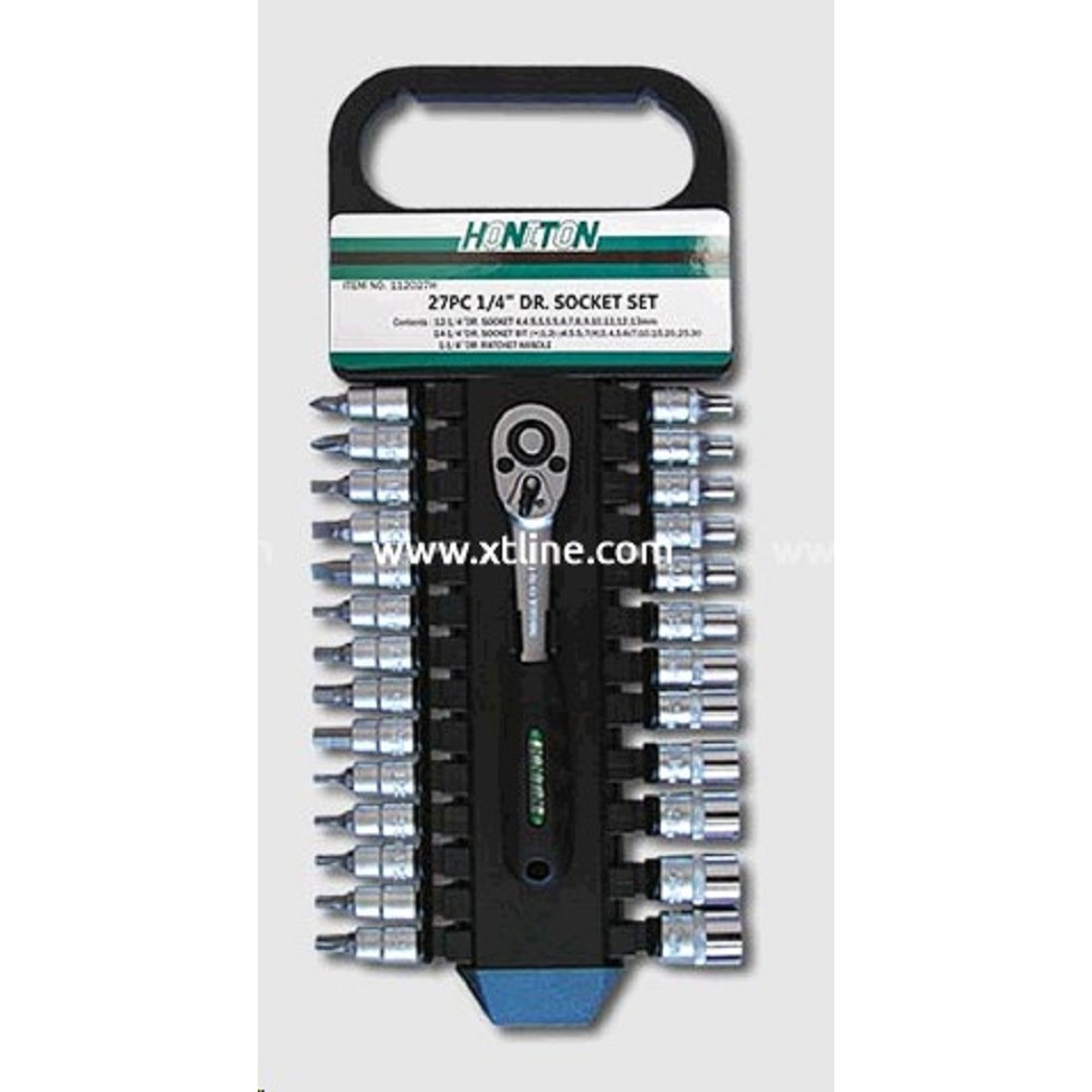 Sada hlavic s ráčnou 1/4" 27 dílů HONITON H1127 Sada hlavic s ráčnou 1/4" 27 dílů HONITON H1127 je kompaktní a praktická sada nářadí určená pro šroubování a montážní práce. Určení: Sada je vhodná pro domácí kutily i pro profesionální použití. Ideální pro šroubování v omezených prostorech díky 1/4" rozměru. Obsah sady: 12x 1/4" hlavice: 4, 4.5, 5, 5.5, 6, 7, 8, 9, 10, 11, 12, 13 mm. 14x 1/4" hlavice bit : PH 1, 2, PL 4,5.5,6, PZ 1,2, TRX 10,15,20,25,30, IBM 3,4,5,6. 1x 1/4" ráčna. Materiál: Chrom-vanadová ocel (CrV) pro vysokou odolnost a dlouhou životnost. Vlastnosti: Kvalitní zpracování. Praktický plastový držák. Kompaktní rozměry sady.
