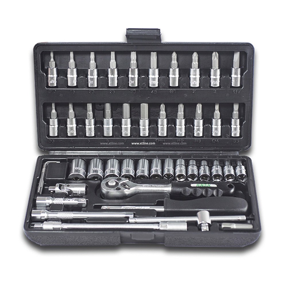 Sada hlavic 1/4" 46-dílů HONITON Sada hlavic 1/4" 46-dílů od značky HONITON je komplexní sada nářadí, která je ideální pro širokou škálu údržbářských a opravárenských prací. Sada obsahuje 46 dílů, včetně nástrčných hlavic, bitů, ráčny a dalšího příslušenství. Nástrčné hlavice různých velikostí pro různé typy šroubů a matic. Ráčna 1/4" pro snadné a rychlé utahování a povolování. Prodloužení, kloub a další příslušenství pro lepší přístup k obtížně dostupným místům. Bity různých typů (ploché, křížové, imbusové, torx) pro univerzální použití. Klíčové vlastnosti: Kvalitní materiál: Nářadí je vyrobeno z chrom-vanadiové oceli (CrV), což zajišťuje vysokou odolnost a dlouhou životnost. Praktický kufřík: Sada je uložena v pevném kufříku, který usnadňuje přenášení a skladování. Univerzální použití: Sada je vhodná pro autoservis, dílnu, domácí použití a další opravárenské práce. 1/4“ hlavice: 4,4.5,5,5.5,6,7,8,9, 10,11,12,13,14 1/4“ ráčna, 1/4“ nástavec s rukojetí 1/4“ kardan, 1/4“ vratidlo 1/4“ nástavec 50,100mm 1/4“ nástavec pružinový Imbus klíče 1.25,1.5,2,2.5 1/4“ adapter na bity 1/4“ hlavice s bity: PH 1,2,3; PL 5.5,6.5,8; IMB 3,4,5,6,7,8,10; TRX 10,15,20,25,27, 30,40,45,50,55