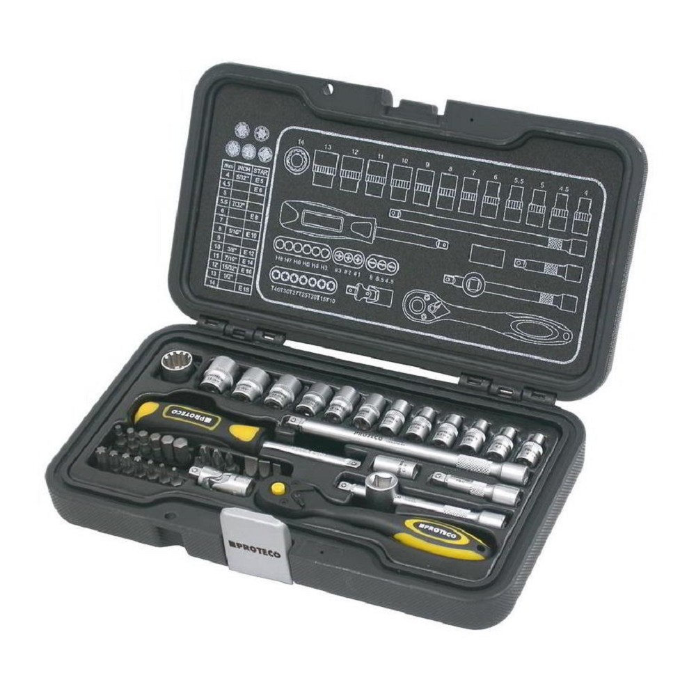 Sada hlavic 1/4" a bitů 40 dílů SPLINE Proteco 43.SN-14-20 Sada hlavic 1/4" a bitů 40 dílů SPLINE Proteco 43.SN-14-20 je komplexní sada nářadí určená pro širokou škálu šroubovacích úkonů. Vlastnosti a obsah sady: Univerzálnost: Sada obsahuje hlavice a bity s profilem SPLINE, které umožňují utahování a povolování různých typů šroubů a matic. Díky tomuto systému SPLINE je možno utažení či povolení prakticky všech typů šroubů. Obsah sady: Sada obsahuje ráčnu, hlavice, bity a další příslušenství v 1/4" provedení. Obsahuje: Ráčnu 1/4" Nástavce Hlavice Bity Materiál: Nářadí je vyrobeno z kvalitní chrom-vanadiové oceli, což zajišťuje jeho odolnost a dlouhou životnost. Praktické balení: Sada je uložena v pevném kufříku, který usnadňuje skladování a přenášení. Použití: Sada je vhodná pro profesionální i domácí použití. Umožňuje práci s různými typy šroubů a matic, včetně těch s profilem SPLINE, imbus, Torx a dalšími.