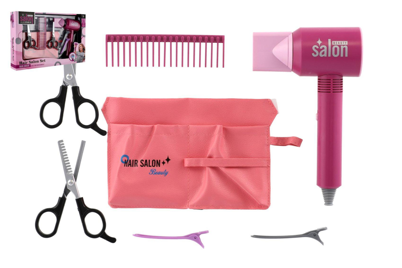 Každá malá parádnice musí mít ve své sbírce tuto sadu krásy s fénem a se spoustou doplňků.. Sada je vhodná pro malé kadeřnice, mohou si tak učesat a vyparádit panenku dle své fantazie. Sada je vyrobena z kvalitního plastu. Sada obsahuje spoustu doplňků včetně fénu. Fén je na baterie. Baterie 3x AAA nejsou součástí balení. Rozměry balení 39 x 26 x 7 cm. Vhodné pro děti od 3 let.