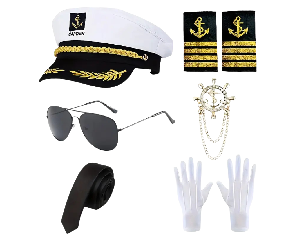 čepice, brýle, kravata, nárameníky, rukavice a odznak.
