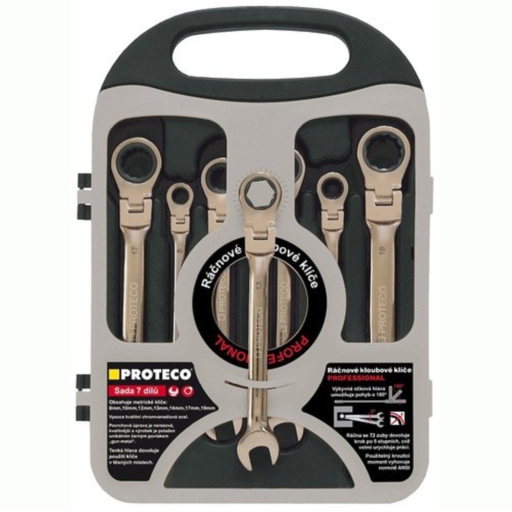 Sada klíčů ráčnových kloubových (8,10,12,13,14,17,19) 42.18-343-772 Popis produktu Sada ráčnových klíčů s kloubem je svým použitím vhodná pro autoprůmysl a dílenství, zejména v místech, kde nelze využít výhody standardní ráčny. Sada ráčnových klíčů s kloubem 7 dílů v kufru obsahuje ráčnové klíče těchto rozměrů 8, 10, 12, 13, 14, 17 a 19mm. Na klíčích je umístěn kloub pro práci pod úhlem a v těžko přístupných místech. Každý klíč ze sadyráčnové klíče 7 dílů v kufru je z kvalitní chrom-vanadiové oceli a navíc potažen unikátním povlakem „GUNMETAL“, který dramaticky zvyšuje ochranu proti korozi a případnému opotřebení. Ráčnu klíče tvoří 72 kalených zubů, které umožňují krok záběru již po 5-ti obloukových stupních. Hlava ráčnového klíče je tenkostěnná a umožňuje tak práci v těžko přístupných místech. Utahovací moment vyhovuje normě ANSI. Obsah balení Metrický klíč OP ráčnový kloubový 8 mm Metrický klíč OP ráčnový kloubový 10 mm Metrický klíč OP ráčnový kloubový 12 mm Metrický klíč OP ráčnový kloubový 13 mm Metrický klíč OP ráčnový kloubový 14 mm Metrický klíč OP ráčnový kloubový 17 mm Metrický klíč OP ráčnový kloubový 19 mm
