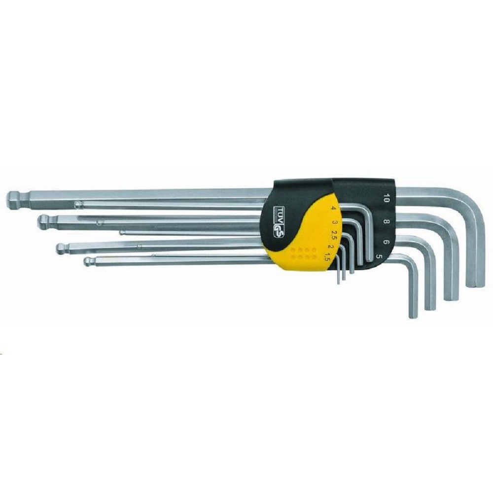 Sada klíčů zástrčných 6HR s kuličkou prodloužené IMBUS 9 ks Sada zástrčných klíčů 6HR s kuličkou 9-dílná představuje velmi užitečného pomocníka pro povolování, nebo utahování šroubů s vnitřním tvarem hlavy 6HR, tzv. imbus. Svým kvalitním zpracováním a praktičností je tak vhodná zejména pro autoprůmysl a jemu podobné mechanické práce. Zástrčné klíče jsou vyrobeny z kvalitní chrom-vanadiové oceli, navíc vhodně a přehledně uspořádány na držáku z vysoce odolného ABS plastu. Obsah balení: Zástrčný klíč 6HR s kuličkou: 1,5-2-2,5-3-4-5-6-8-10