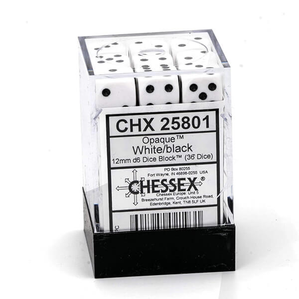 Balení se 36 kusy bílých šestistěnných kostek s černými tečkami od společnosti Chessex o straně 12 mm. Sada obsahuje 36 kvalitních bílo-černých kostek. Kostky mají na sobě puntíky a rohy jsou zaoblené. Využijete je v nejrůznějších karetních a deskových hrách nebo všude tam, kde budete potřebovat kostky. Hodí se také na karetní hry Magic the Gathering, či Pokémon pro značení poškození, counterů apod. V balení je 36 kusů kostek o straně 12 mm s plastovou krabičkou.