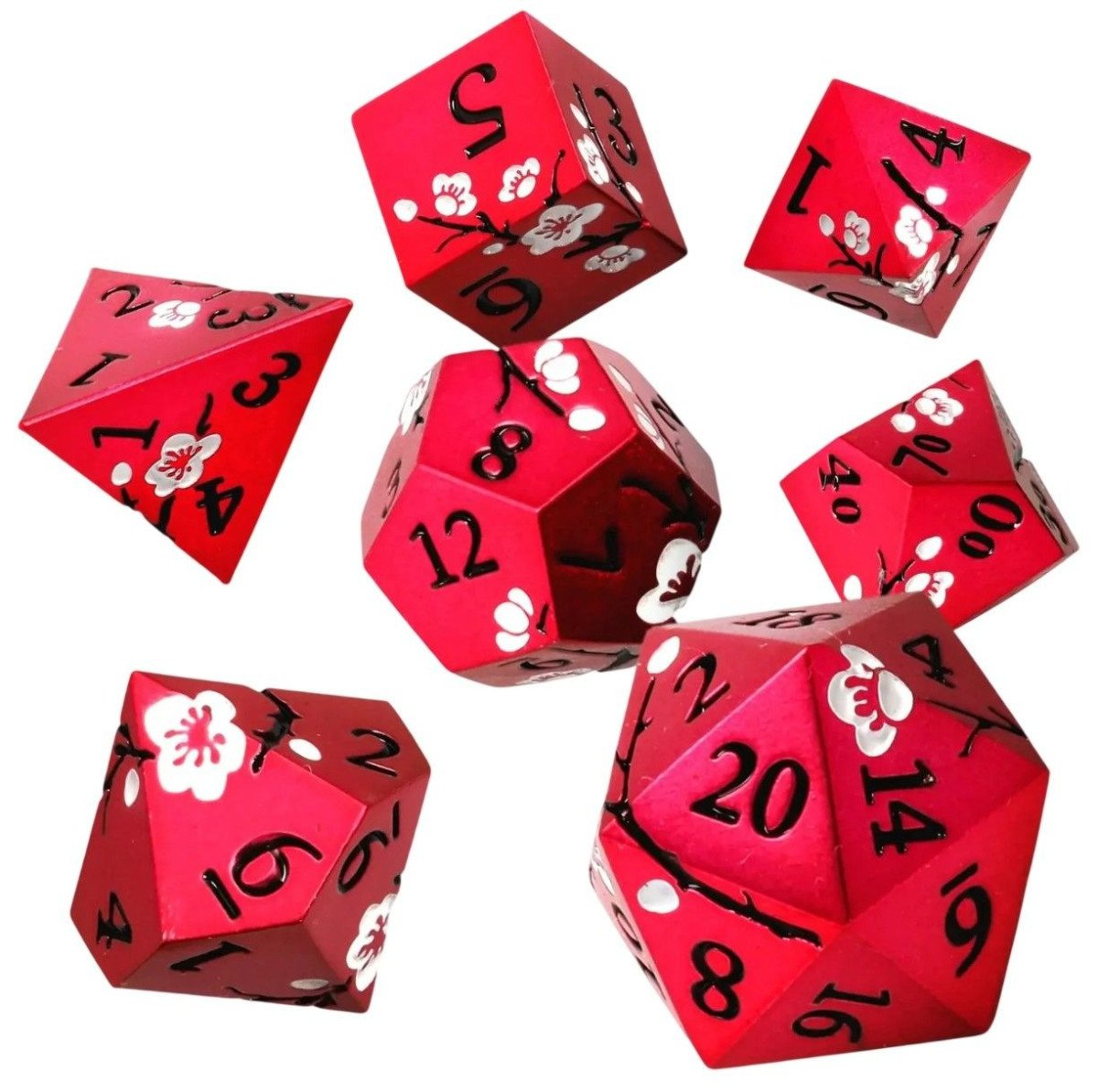 Tmavě karmínové matné kovové kostky s bílými květy třešní a černými větvičkami mezi čísly. Elegantní, přesto s váhou skutečného válečného kladiva. Každá sada je dodávána v jedinečném boxu, který kromě ochrany kostek zároveň slouží jako kostková věž. Součástí balení jsou i dvě vinylové samolepky GlassStaff a malé překvapení, které objevíš po rozbalení sady.