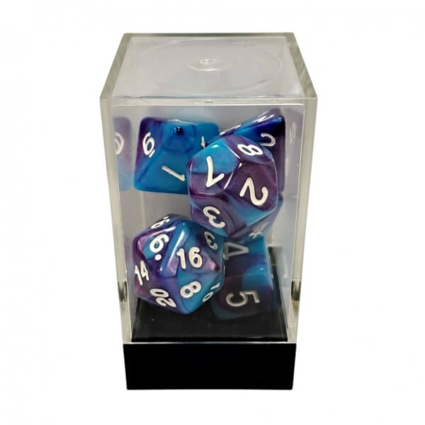 Sada 7 kusů dvoubarevných modro-fialových kostek v krabičce jsou ideálním doplňkem pro Vaše hry. Kostky v modro-fialové barvě s bílými čísly vyniknou díky dvoubarevnému designu. Najdete zde všechny důležité typy kostek: čtyřstěnnou, šestistěnnou, osmistěnnou, desetistěnnou, dvanáctistěnnou, dvacetistěnnou a s procenty. V balení naleznete tyto kostky: 1x D4, 1x D6, 1x D8, 1x D10, 1x D12, 1x D20, 1x kostku s procenty.
