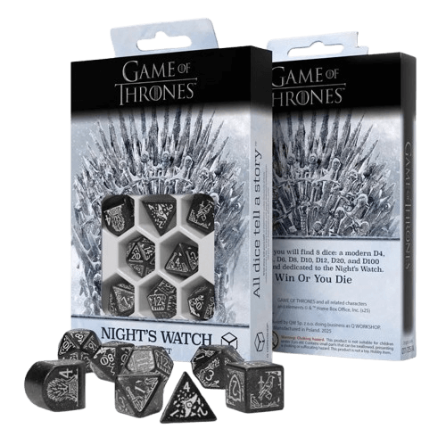 Sada kostek Game of Thrones: Night's Watch, černé kostky s jemným třpytivým prachem jsou zvýrazněny světle šedými rytinami. Tato oficiálně licencovaná sada kostek vzdává poctu Noční hlídce - bratřím v černém, kteří stojí mezi světem živých a temnotou na severu. Tato sada obsahuje kostky 8 ks: D6, D8, D10, D00, D12, D20 a dvě verze D4 (klasickou a moderní). Barvy - černé kostky s jemným třpytivým prachem jsou zvýrazněny světle šedými rytinami Znaky Severu – Nejvyšší hodnoty na jednotlivých kostkách nesou symboly Noční hlídky: meč a havrana Poklad pro každého hráče – kostky jsou precizně vyrobené z prvotřídního materiálu, ideální pro RPG (DnD) dobrodružství, deskové hry i cenným sběratelským kouskem každého fanouška Hry o trůny.