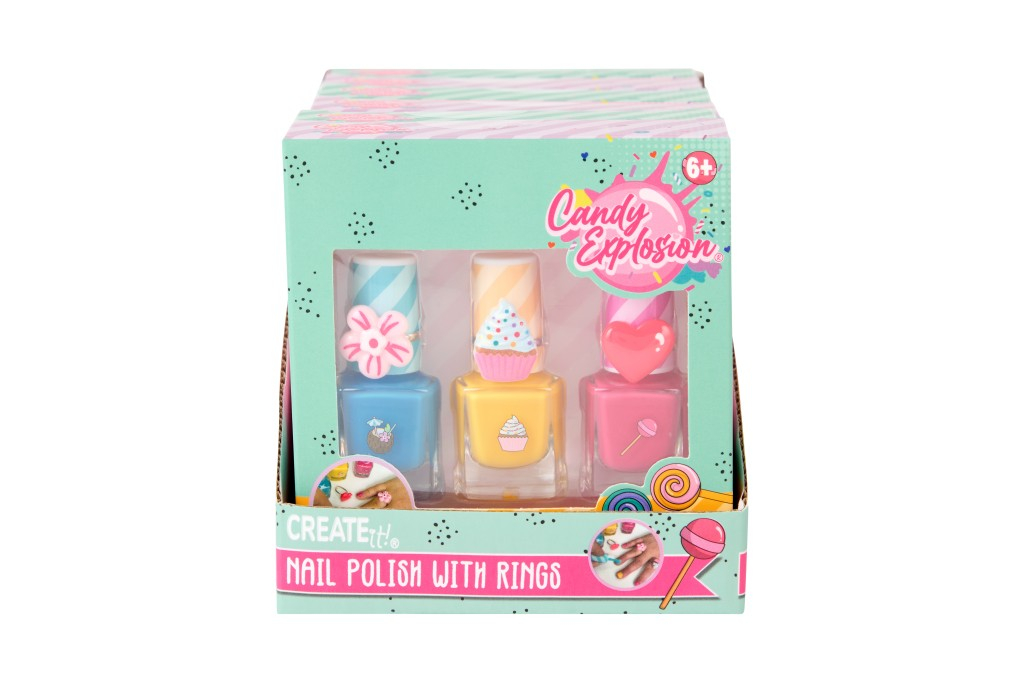 Sada laků na nehty s prstýnkem Candy – barevná sada mini laků na nehty doplněná stylovým prstýnkem jako malý bonus. Skvělá volba pro dívky, které si rády hrají s barvami a chtějí si užít kreativní zdobení nehtů. Ideální jako dárek nebo zábava pro každodenní použití.Dva různé druhy.