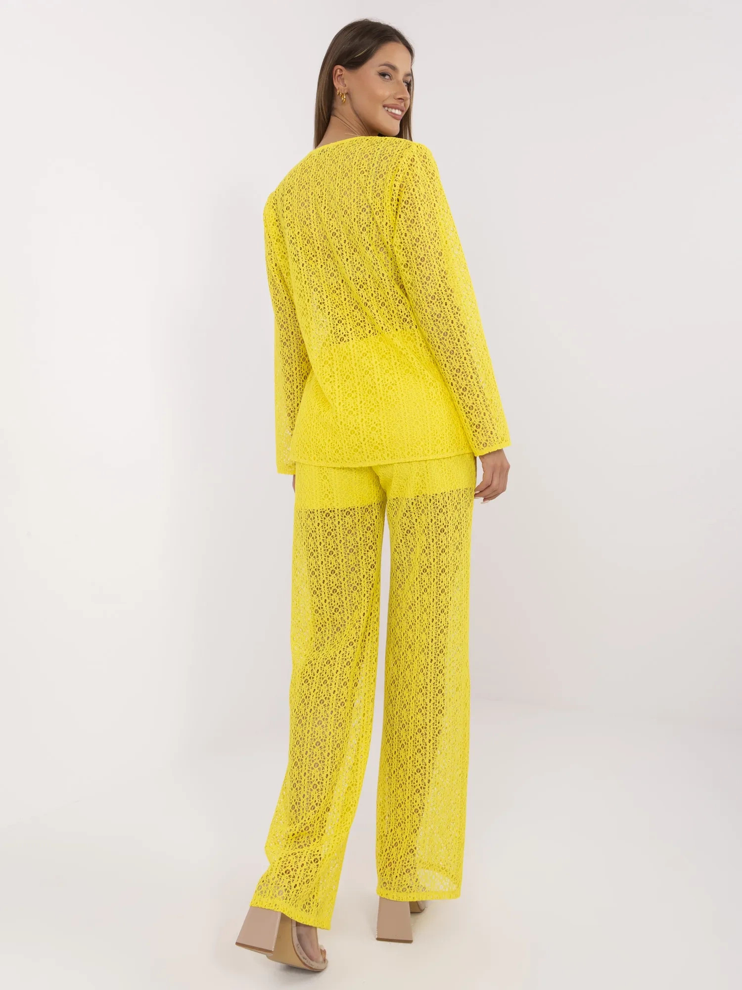 Modelka má na sobě velikost S/M. Rozměry modelky: výška 176 cm, prsa 90 cm, pas 62 cm, boky 94 cm. Rozměry halenky ve velikosti S/M. měřeno na plocho: šířka v podpaží - 57 cm, délka rukávu - 62 cm (od švu), šířka v bocích - 58 cm, celková délka - 73 cm. Rozměry kalhot ve velikosti S/M: šířka v pase - 31 cm (na plocho), šířka v pase - 49 cm (při natažení), výška v pase - 30 cm, celková délka - 114 cm.Velikost alt.VýškaObvod hrudníkuVnější délka rukávůVnější délka rukávuS/M36/38160-17282-8659-6149-51L/XL40/42164-17891-9663-6553-55