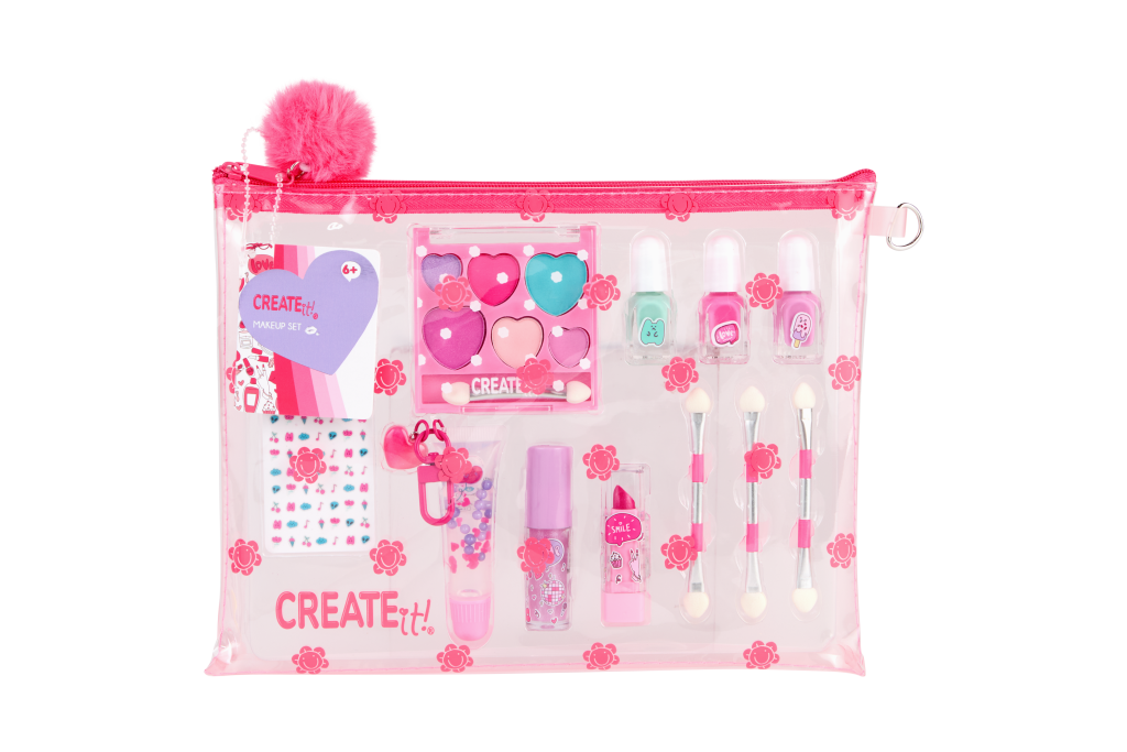 Sada make up v taštičce obsahuje – 3 laky na nehty, 3 aplikátory, lesk na rty, balzám na rty a samolepky na nehty.