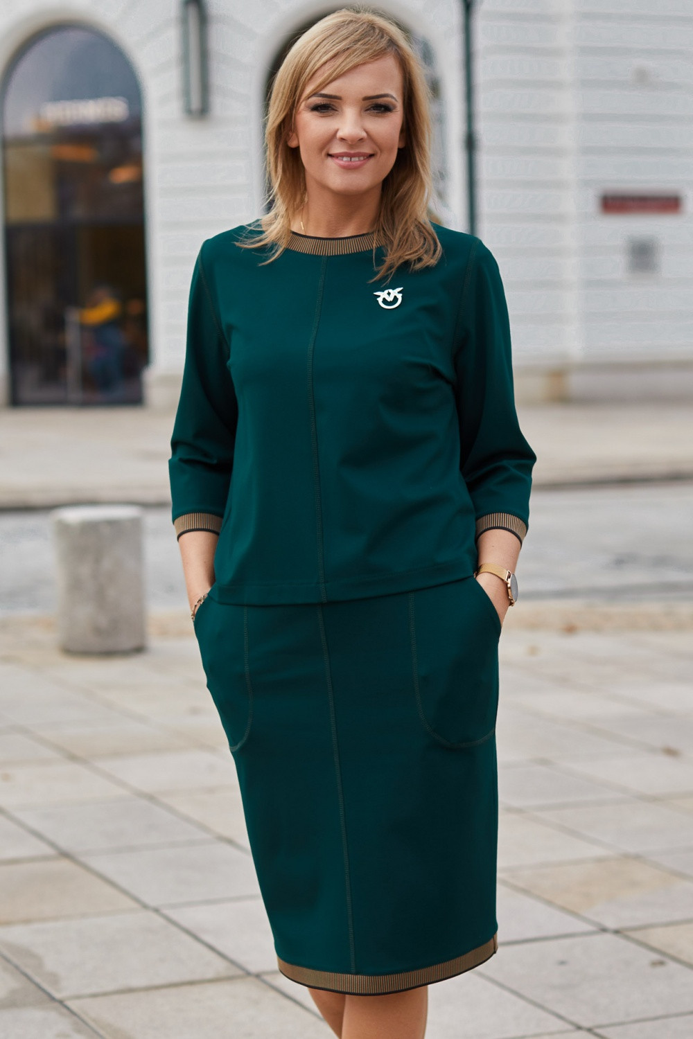 Tato dvoudílná dámská souprava si získala srdce našich zákazníků. Byl celý ušitý z měkkého úpletu MORGAN. Horní část má krabicový tvar s ozdobným žebrováním. Mírně vypasovaná sukně s kapsami dodává módní nádech. Díky široké gumě všité do pasu se sukně dokonale přizpůsobí postavě majitelky. Celek je na horní části a na sukni zdoben švy. Atraktivitu zvyšuje také ozdobné prošívání a zlatý špendlík. Tento promyšlený střih poskytuje pohodlí ženám všech velikostí. Bez podšívky. Elastan 5 % Polyester 20 % Viskóza 75 % Velikost Obvod beder Obvod prsou Obvod v pase 3694-98 cm84-88 cm70-74 cm3898-102 cm88-92 cm74-78 cm40102-106 cm92-96 cm78-82 cm42106-110 cm96-100 cm82-86 cm44110-114 cm100-104 cm86-90 cm46114-118 cm104-108 cm90-94 cm48118-122 cm108-112 cm94-98 cm