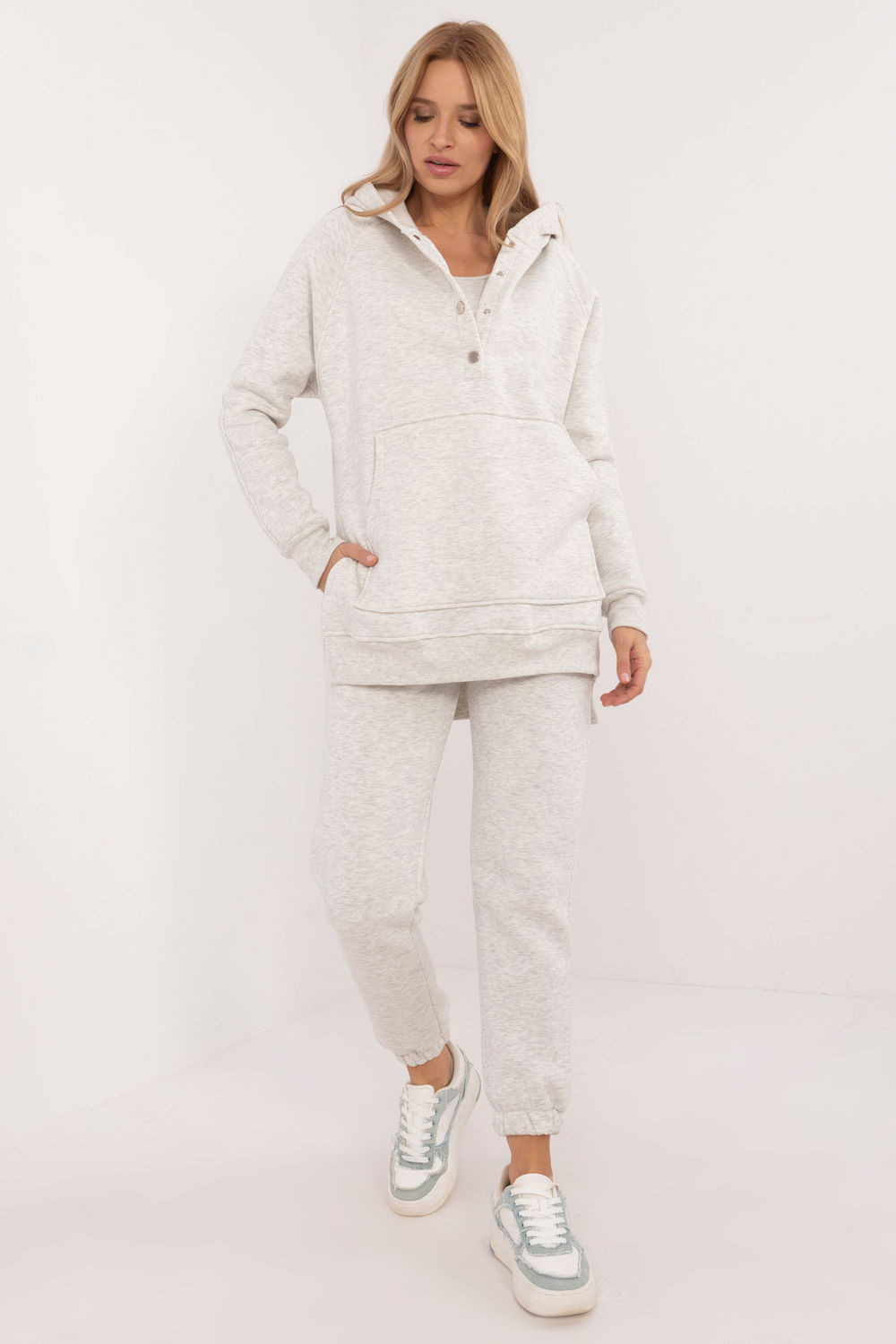 Zateplená dámská souprava v ležérním stylu, ideální pro chladnější dny a každodenní vycházky, se skládá z trička, mikiny a kalhot. Souprava se vyznačuje melanžovým vzorem, který jí dodává jedinečný nádech. Je vyrobena převážně z bavlny a poskytuje pohodlí a teplo, ideální pro podzimní a zimní dny. Kalhoty mají dlouhé nohavice s žebrovanými lemy a vysoký střih, který zvýrazňuje siluetu a zaručuje pohodlné nošení. V pase je stahovací šňůrka pro dokonalé přizpůsobení a zasouvací boční kapsy jsou praktickým řešením pro drobnosti. Mikina s dlouhým rukávem se zapíná do poloviny pomocí patentek, což jí dodává originalitu a usnadňuje oblékání. Má také kapuci a velkou klokaní kapsu, která dodává sportovní nádech a další funkčnost. Je doplněna klasickým tričkem, čímž vzniká pohodlný a stylový komplet, ideální pro každodenní styling v chladnějších dnech. Bavlna 70 % Polyester 30 % Velikost DélkaObvod prsou Obvod v pase universal81/42/96 cm120/76 cm68 cm