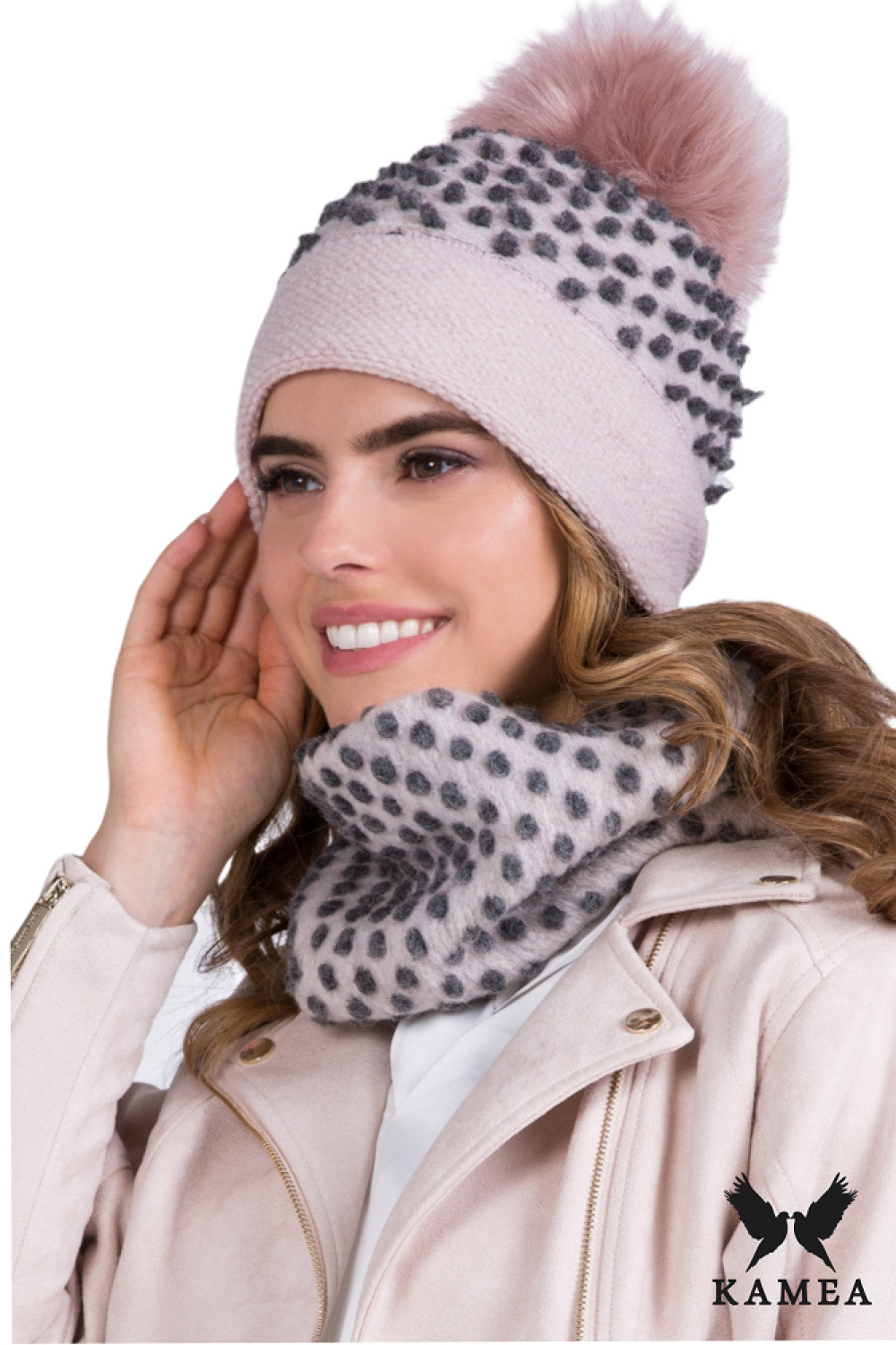 FOKS KOMPLET dámský je neobvyklou nabídkou pro ženy, které si váží originálního stylu. Skládá se z růžové čepice s límcem vyrobené z vysoce kvalitní vlněné příze. Čepice je navíc vybavena měkkou podšívkou z fleece, což zajišťuje teplo a pohodlí při nošení. Výrazný vzor v reliéfních puntíků spojený s hladkým povrchem materiálu přitahuje pozornost a dodává celému outfitu charakter. Velký ECO bude na vrcholu čepice dodávat kouzlo. Kompletní sada ideální na podzim a zimu, k dispozici v několika různých barevných variantách. Složení 63 % bavlna, 18 % polyester, 19 % polyakryl.