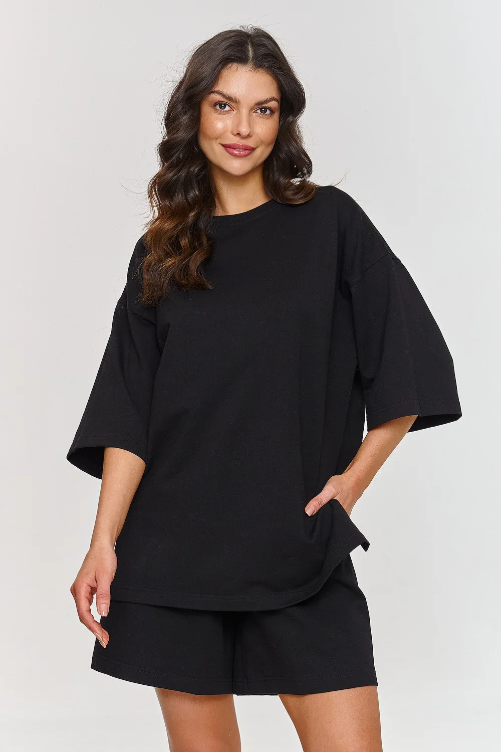 Tento pohodlný teplákový set je ideálním řešením pro ženy, které ocení pohodlí a nadčasovost ve svých každodenních stylizacích. Přesný střih trička zaručuje plnou volnost pohybu a módní vzhled. Krátký rukáv a klasický kulatý výstřih z něj činí ideální nezávaznou základnu pro každodenní stylizace. Kraťasy mají elastický pas, co zajišťuje správné přizpůsobení a boční kapsy zdůrazňují jejich funkčnost. Volný střih kalhot a široké nohavice zaručují plnou volnost pohybů a kratší délka je ideální pro teplé dny. Jednoduchý, ale efektní teplákový set spojuje minimalistický design s pohodlím a vytváří skvělou volbu pro každodenní stylizace. Je to must-have pro relaxaci doma, setkání s přáteli nebo krátké výlety. Jeho univerzálnost však umožňuje také využití při různých fyzických aktivitách. Bavlna 95 % Elastan 5 % Velikost DélkaObvod beder Obvod prsou Obvod v pase 3668/42 cm100 cm112 cm84 cm3870/44 cm104 cm116 cm88 cm4072/46 cm108 cm120 cm92 cm4274/48 cm112 cm124 cm96 cm