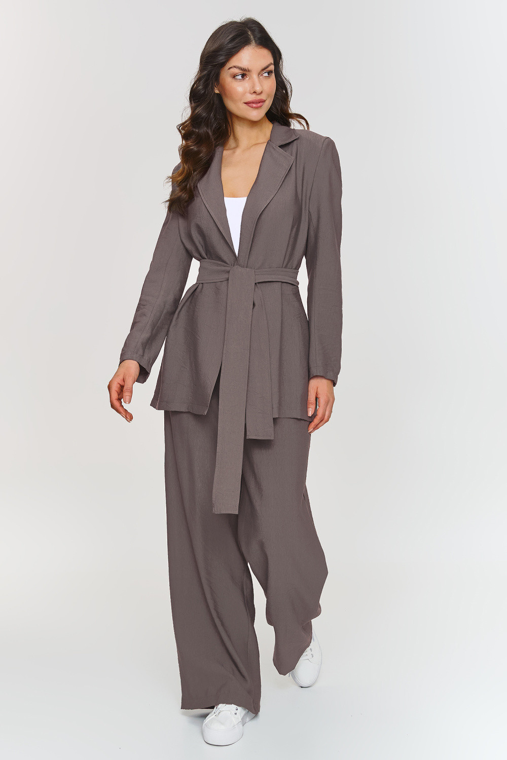Tento dámský set byl navržen s ohledem na ženy, které hledají spojení stylu, pohodlí a moderní elegance. Sako s delším volným střihem dodává stylizaci moderní charakter a vázaný pásek umožňuje přizpůsobení postavě a zdůrazňuje pas. Nemá podšívku, což ho dělá lehčím a volnějším. Kalhoty s širokými nohavicemi zdůrazňují módní vzhled a elastický pas zajišťuje maximální pohodlí. Model je vyroben z lehkého, strukturálního materiálu, který zdůrazňuje jeho výjimečnost a eleganci. Další výhodou je možnost nošení každého kusu samostatně, tvořící různorodé a originální outfit. Díky jednoduchému, ale efektnímu designu je tento set skvělým řešením jak pro výlety s přáteli, tak do kanceláře, na obchodní schůzky a jiné formální události, kde chcete vypadat profesionálně a zároveň neustupovat pohodlí. Nylon 15 % Rayon 85 % Velikost DélkaObvod beder Obvod prsou Obvod v pase 3672/108 cm100 cm96 cm88 cm3874/108 cm104 cm100 cm92 cm4076/110 cm108 cm104 cm96 cm4278/110 cm112 cm108 cm100 cm