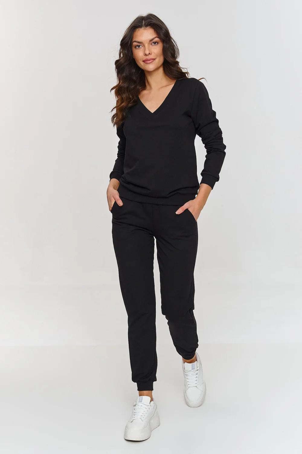 Dámská souprava se sportovním oblečením, zachovaná v jednoduché estetice, se hodí téměř na každou příležitost. Souprava se skládá z mikiny, která se obléká přes hlavu, a klasických a pohodlných kalhot. Mikina nemá kapuci, má však výstřih do V, který je lemován lemovkou a zakončený opletením, což celému kompletu dodává nádech elegance. Lemovky jsou také přítomny na rukávech a v dolní části mikiny, díky tomu se skvěle přizpůsobuje postavě. Kalhoty jsou vyrobeny ze stejného materiálu, mají boční kapsy a lemovky umístěné v pasu a na dolní části nohavic. Tato souprava je skvělou volbou pro ženy, které si ve svém šatníku cení klasiky a nadčasovosti. K ní si obujte designové tenisky nebo jednoduché tenisky, v každém provedení se bude souprava prezentovat velmi stylově. Bavlna 95 % Elastan 5 % Velikost DélkaObvod beder Obvod prsou Obvod v pase 3666/94 cm92 cm100 cm60-88 cm3866/94 cm96 cm104 cm64-92 cm4070/96 cm100 cm108 cm68-96 cm4270/96 cm104 cm112 cm72-100 cm