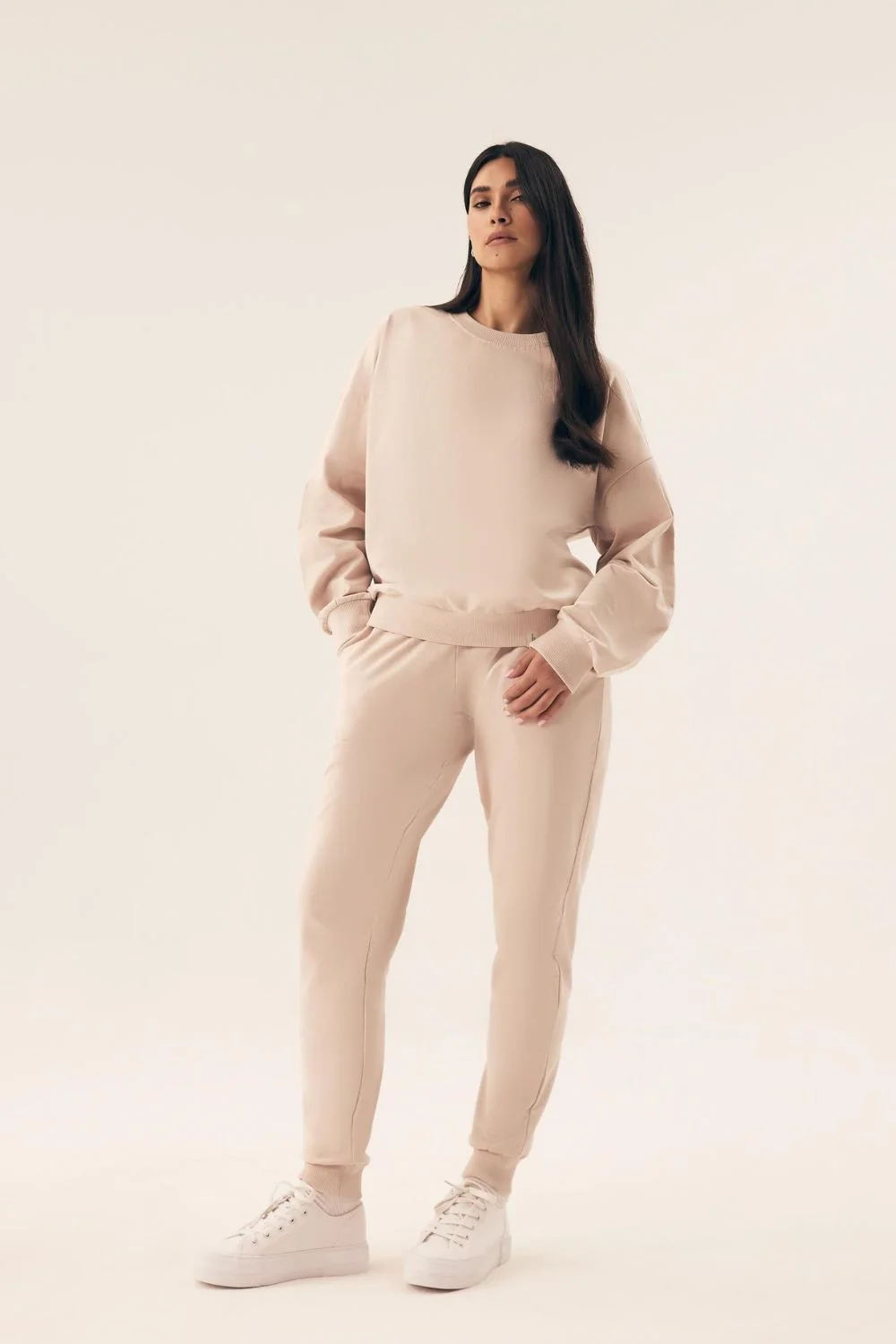 Pohodlný dámský teplákový oblek s volným střihem, ideální pro relaxaci doma, procházky nebo každodenní aktivity. Mikina s dlouhým rukávem, kulatým výstřihem a praktickými kapsami poskytuje pohodlí a volnost pohybu. Dlouhé kalhoty s širokým pásem skvěle padnou k postavě, a nohavice a rukávy s elastickými manžetami dodávají celku sportovní charakter. Skvělá volba pro ženy, které ocení pohodlí spojené s módním vzhledem. Bavlna 100 % Velikost Obvod beder Obvod prsou Obvod v pase L102-106 cm96-100 cm76-80 cmM98-102 cm92-96 cm72-76 cmS94-98 cm88-92 cm68-72 cm