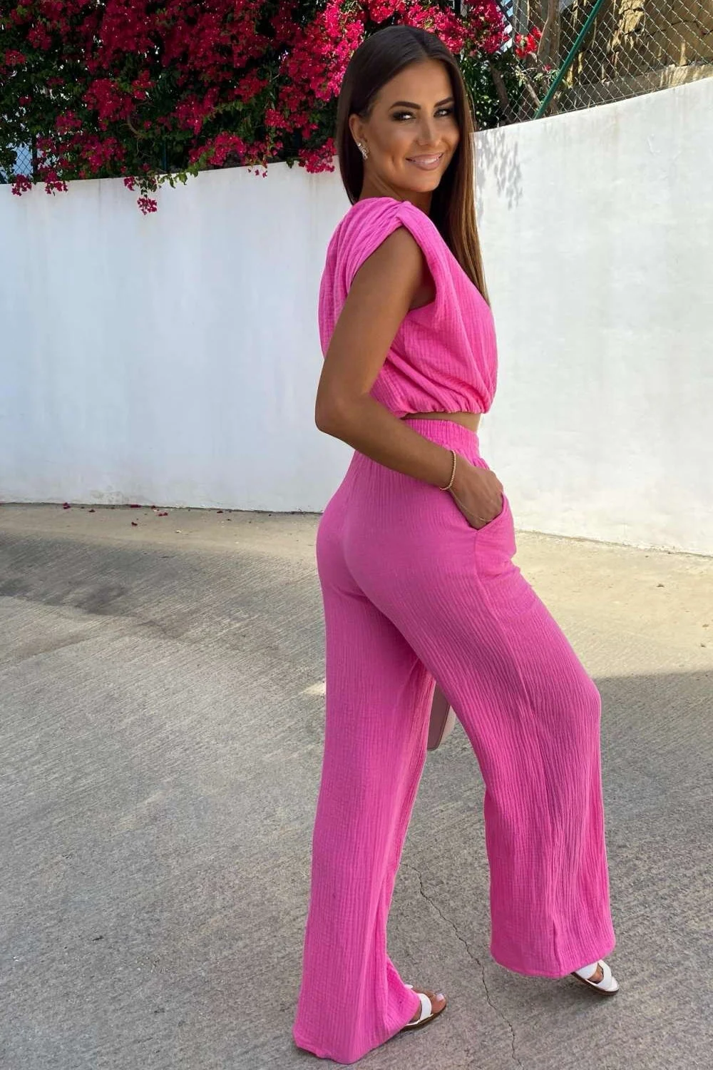 Mušelínový set je skvělou kombinací pohodlí a stylu. Lehounký, bezrukávový top je zakončen elastickým lemem dole, díky čemuž se skvěle přizpůsobuje postavě a zajišťuje pohodlí při nošení. Dlouhé kalhoty s měkkým gumovým pásem zajistí volnost pohybu a kapsy na zip dodají praktičnost. Celkový vzhled vyrobený z prodyšného mušelínu je ideální pro teplé dny, vytvářející ženský a přirozený outfit.