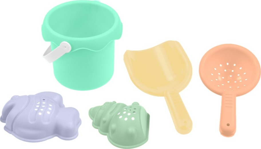 Sada na písek 5ti dílná – obsahuje kyblík, lopatičku, hrabičky a bábovičky .