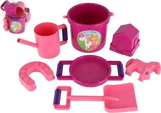 Sada na písek statek s poníkem, která obsahuje kyblík, sítko, lopatku a bábovičky. 7ks. Vhodné od 3 let.