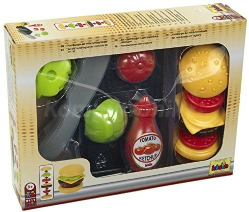 Sada na výrobu hamburgerů. Vytvořte si hamburger. Nakrájejte zeleninu nožem na prkénku a položte ji na sendvič s hamburgerem a omáčkou. Obsah: 1 prkénko 1 nůž 1 chléb 1 hamburger 1 plátek sýra 1 láhev omáčky 2 druhy zeleniny.