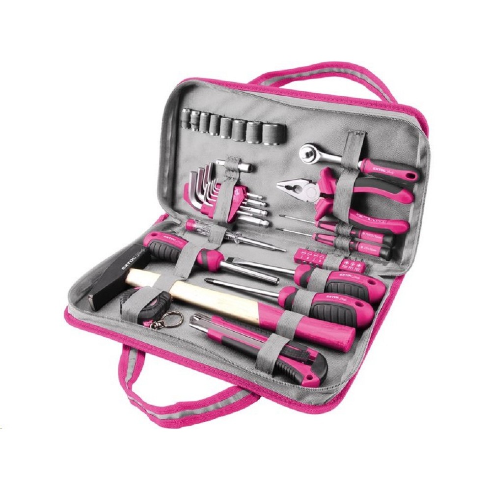 Sada nářadí 39 dílů 1/4" Extol Lady 6596 - Sada nářadí v růžové barvě designově laděná pro šikovné ženy a slečny. - Sada nářadí EXTOL CRAFT 6596 obsahuje křížové a ploché šroubováky, kladivo, kombinované kleště, nůž s lámací čepelí, sadu imbus klíčů, ráčnu 1/4" a sadu hlavic, svinovací metr, fázovou zkoušečku a držák na bity. - Nářadí je uschováno v pevném textilním obalu na zip se 2 uchy na přenášení. - Materiál nářadí: CrV - Chrom-vanadiová ocel. - Sada obsahuje: - 1/4" ráčna - 1/4" hlavice nástrčné šestihranné - velikosti 5 - 6 - 7 - 8 - 10 - 12 - 13 - 14 mm - 1/4" prodlužovací nástavec 50 mm - 1/4" bity délky 25 mm: plochý 3 - 4 - 5 - 6 mm, křížové bity PH0 - PH1 - PH2 - PZ0 - PZ1 - PZ2 - 1/4" magnetický šroubovák na bity (držák bitů) - sada imbus L-klíčů: 1,5 - 2 - 2,5 - 3 - 4 - 5 - 6 - 8 - 10 mm - šroubováky: plochý 6,5 x 100 mm, křížový PH2 - mikrošroubováky: plochý 2,5 x 50 mm, křížový PH00 x 50 - fázová zkoušečka 100 - 250V AC - kladívko 300 g - odlamovací nůž 18 mm - kombinované kleště 160 mm - svinovací metr - délka 2 metry, šířka pásky 8 mm - textilní taška na nářadí s dvěma uchy