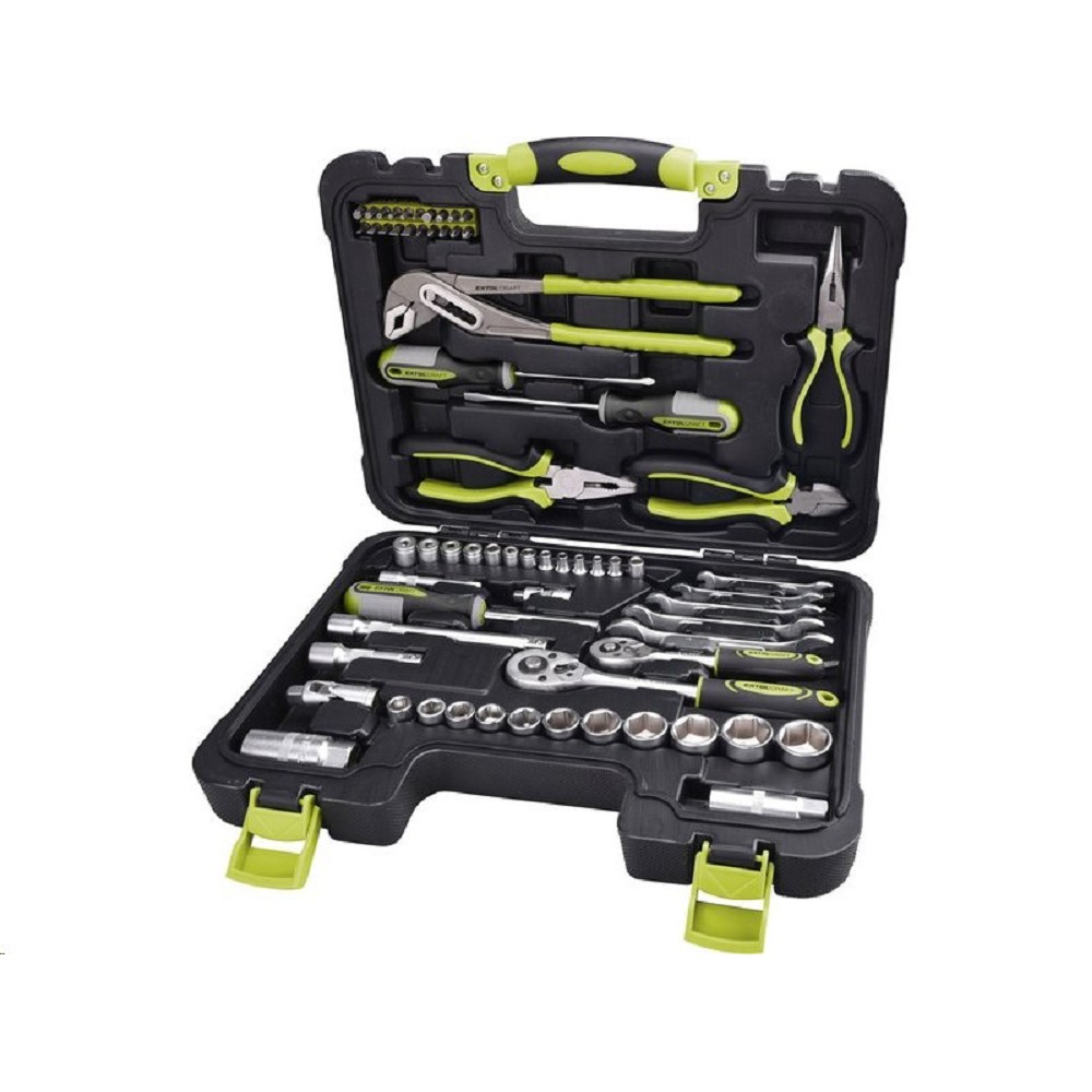 Sada nářadí a hlavic v kufru 1/2 + 1/4 65 ks Extol Craft 6598 Sada nářadí a hlavic v kufru Extol Craft 6598 je poměrně rozsáhlá souprava obsahující jak 1/2", tak 1/4" nástroje, což z ní činí univerzálního pomocníka pro různé opravy a montážní práce. Označení "Craft" u značky Extol obvykle značí hobby nebo poloprofesionální úroveň nářadí s dobrým poměrem cena/výkon. Popis produktu Sada obsahuje: Kleště: kombinované; čelní štípací; s dlouhou čepelí; siko kleště ráčna: 1/4", 3/8" hlavice nástrčné: 1/4": 4; 4,5; 5; 5,5; 6; 7; 8; 9; 10; 11; 12; 13 mm 3/8": 10; 11; 12; 13; 14; 15; 17; 19; 21; 22; 24 mm klíč na svíčky: 16; 21mm prodlužovací nástavec: 1/4" x 75 mm; 3/8" x 75 mm; 3/8" x 150 mm univerzální kardan: 1/4"; 3/8" klíče: otevřené 6x7; 8x9; 10x11; 12x13; 14x15 mm adaptér na bity: 1/4" bity: Plochý SL 3; 4; 5; 6; 6 Křížový PH 0; 1; 2; 2; 3 Imbus HEX 3; 4; 5; 6 Torx T 10; 15; 20; 25; 30; 40 šroubovák: PH2 x 100 mm; SL6 x 100 mm materiál: CrV