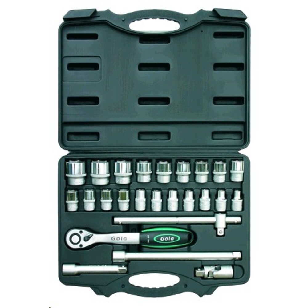 Sada nástrčných hlavic 1/2"-25 dílů GOLA Popis produktu Nářadí poskytuje svým uživatelům vysokou kvalitu při velice příznivé ceně. Toto nářadí je určeno pro průmyslovou aplikaci i do dílen kutilů. Rozpis nářadí v sadě 25 dílů: počet ks položka velikost mm 20 hlavice 1/2' 8, 9, 10, 11, 12, 13, 14, 15, 16, 17, 18, 19, 20, 21, 22, 23, 24, 27, 30, 32 1 ráčna 1/2' 250 2 nástavce 1/2' 125 a 250 1 vratidlo 1/2' 250 1 kardan1/2' 73