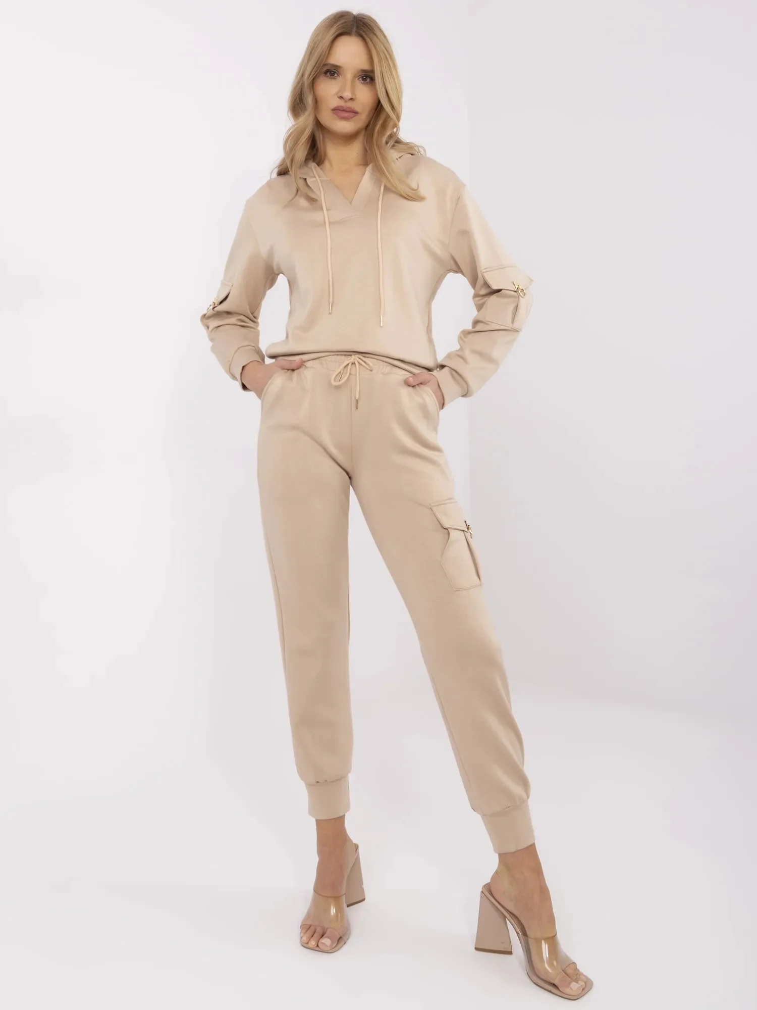 Modelka má na sobě velikost S/M. Rozměry modelky: výška 175 cm, prsa 90 cm, pas 66 cm, boky 94 cm. Rozměry halenky ve velikosti S/M měřené na plocho: šířka v podpaží - 51 cm délka rukávu - 55 cm (od švu), šířka v bocích - 42 cm, celková délka - 57 cm. Rozměry kalhot ve velikosti S/M šířka v pase - 33 cm (naplocho), šířka v pase - 55 cm (od švu), výška v pase - 29 cm, šířka v bocích - 50 cm, celková délka - 95 cm.Velikost Alt.VýškaObvod hrudníkuVnější délka rukávuVnější délka rukávuM/L38/40162-17486-9161-6351-53S/M36/38160-17282-8659-6149-51